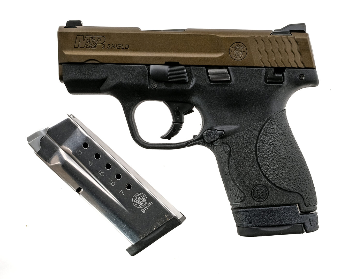 Description Smith & Wesson M&P9 Shield chambered in 9mm with one, seven round magazine, one eight round magazine and a 3.125″ barrel. Textured polymer frame with push button magazine release, polymer trigger, serrated takedown lever, slide release, and manual safety. Bronze finished serrated slide with three-dot iron sights. Comes in its factory box with matching serial number, factory paperwork, lock, and two magazines. Must ship to FFL holder. Condition: New in box. Barrel Length: 3.125″ Serial: JFK6548 Manufacturer: SMITH & WESSON Caliber: 9x19mm Parabellum Model: M&P9 Shield