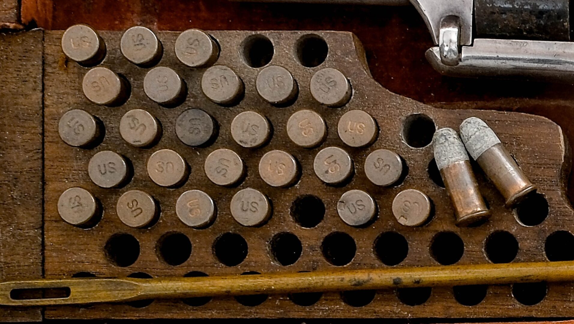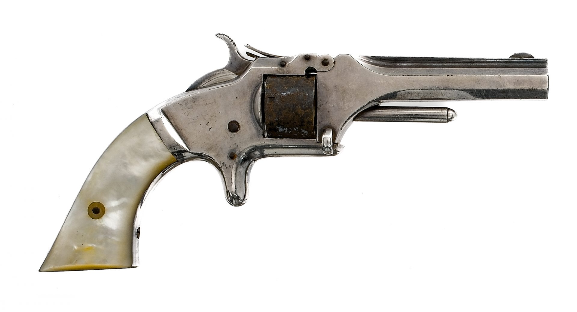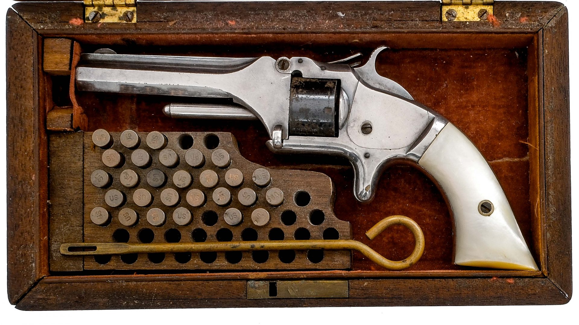 Description Smith & Wesson Model Number one, second issue in .22 Rimfire Short with a seven round capacity and a 3.25″ octagon barrel. Mother of pearl grip plates. Nickel finished frame, solid trigger and barrel. Blued checkered hammer and cylinder. Underside of frame located barrel tip up lever. Front and rear fixed sights. Comes in a red velvet lined locking wooden case with Silver monogram plate on the cover. Plate is marked: E.A.B. Comes with copper cleaning rod and twenty eight U.S. marked .22 Short live rounds. Antique, No FFL required and ships to MOST buyers homes. Condition: Antique, Very Good with scratches, finish wear and rust on the cylinder. The action does not cycle properly. The rifled bore has rust/pitting. Barrel Length: 3.25″ Serial: 67199 Manufacturer: Smith & Wesson Caliber: .22 RF Short Model: No 1 2nd Issue Year-Range 1860-1868