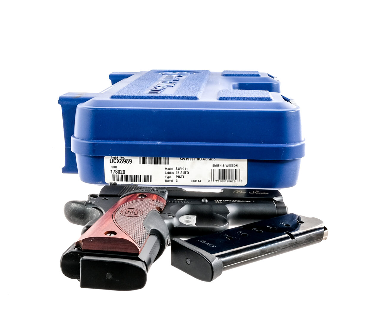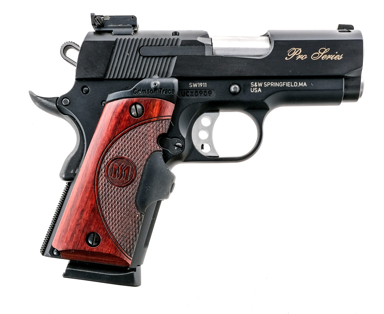 Description Smith & Wesson Performance Center SW1911 Pro Series chambered in .45 ACP with two, seven round removable magazines and a 3″ stainless steel barrel. Scandium frame with ribbed front strap and checkered backstrap. Checkered wood Crimson Trace red laser grips. Three hole curved trigger with overtravel stop. Manual thumb safety and beavertail grip safety. Skeletonized ribbed hammer. Full length guide rod and oversized external extractor. Serrated slide with front blade and adjustable rear white dot iron sights. Comes in its factory box with matching serial number, factory paperwork, extra springs, and two magazines. Must ship to FFL holder. Condition: Very good with light scratches and handling wear. Clean rifled bore. Barrel Length: 3″ Serial: UCX8989 Manufacturer: SMITH & WESSON Caliber: .45 ACP Model: Performance Center SW1911 Pro Series Book# 01997
