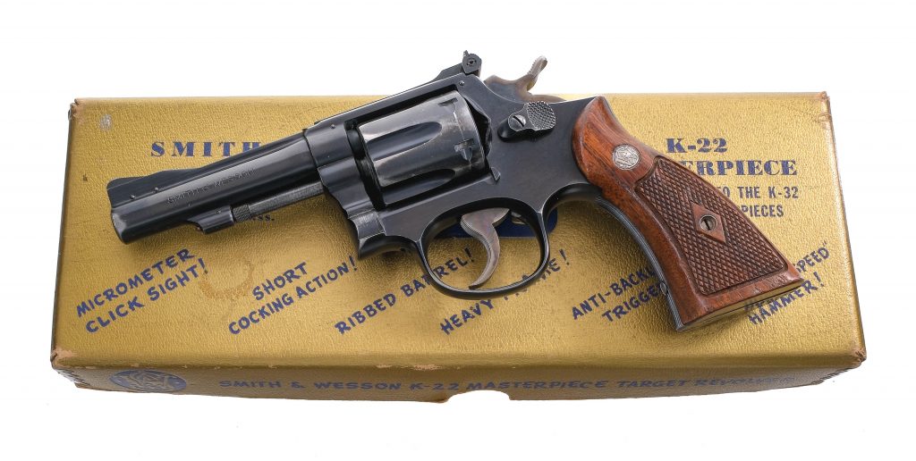 Description Smith & Wesson “Pre Model 18″ K-22 Combat Masterpiece chambered in .22 long rifle with a six-shot cylinder and a 4″ pinned barrel. Manufactured in 1952 with serial number K168980. Blued barrel, five screw frame, fluted cylinder, and checkered cylinder release. Case colored double action trigger and hammer. Checkered wood diamond grips with S&W medallions. Adjustable rear sight and fixed red front blade. Comes in its factory gold box with matching model/barrel length. Must ship to a FFL or C&R holder. Condition: Good/Very good with scratches, sharp edge wear, and general handling wear. Finish loss on the cylinder and near the muzzle. General operational wear on the moving parts and contact points. Cylinder turn line. Light wear on the grips. Bright and clean bore with strong rifling. Barrel Length: 4” Serial: K168980 Manufacturer: SMITH & WESSON Year: 1952 Caliber: .22 Long Rifle Model: K-22 Combat Masterpiece Book# 03851
