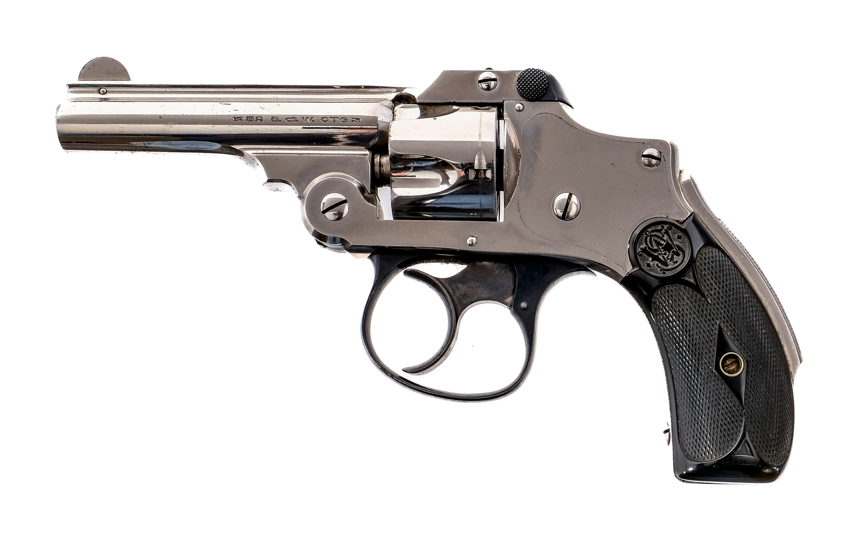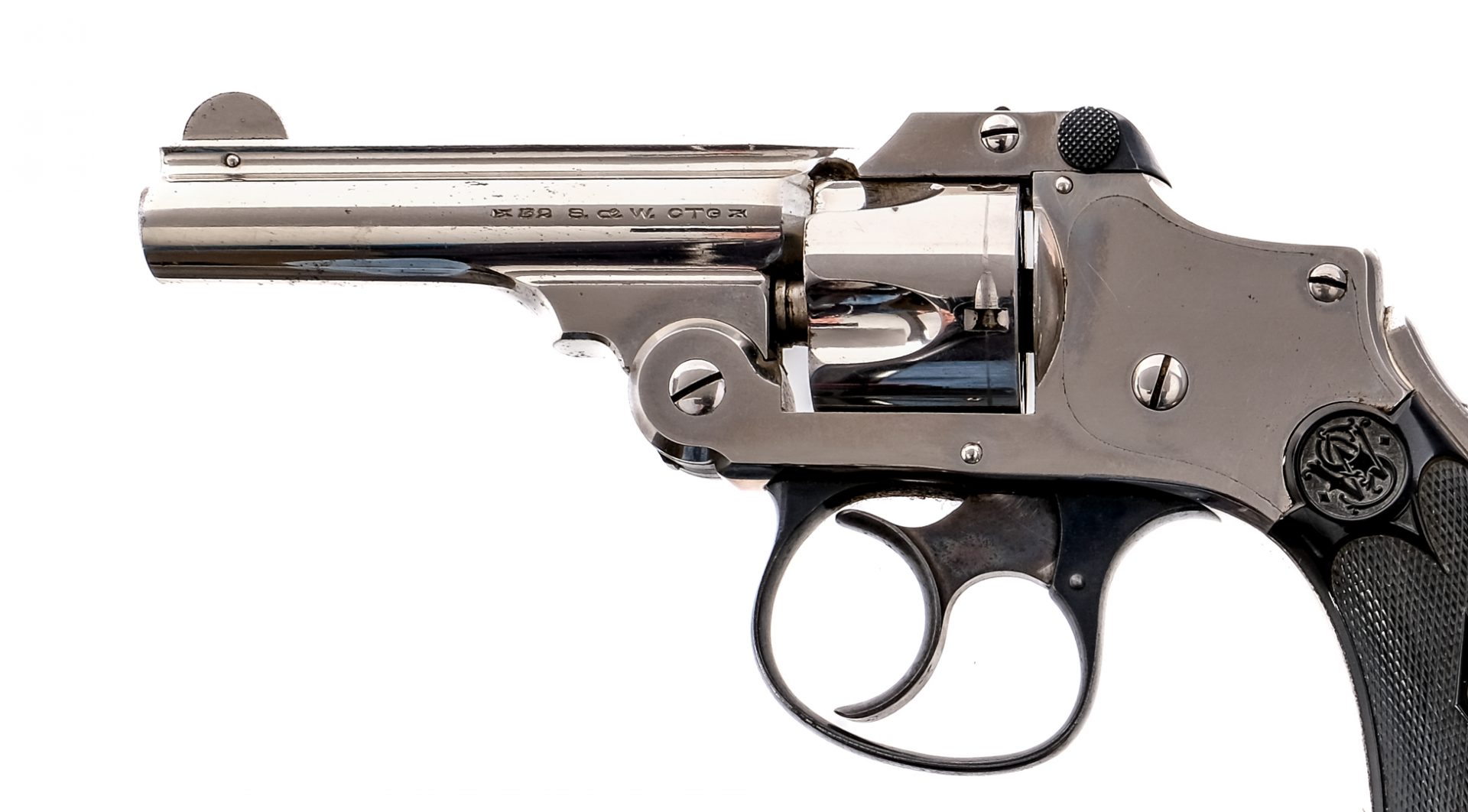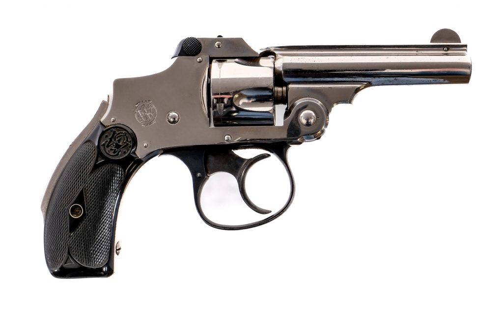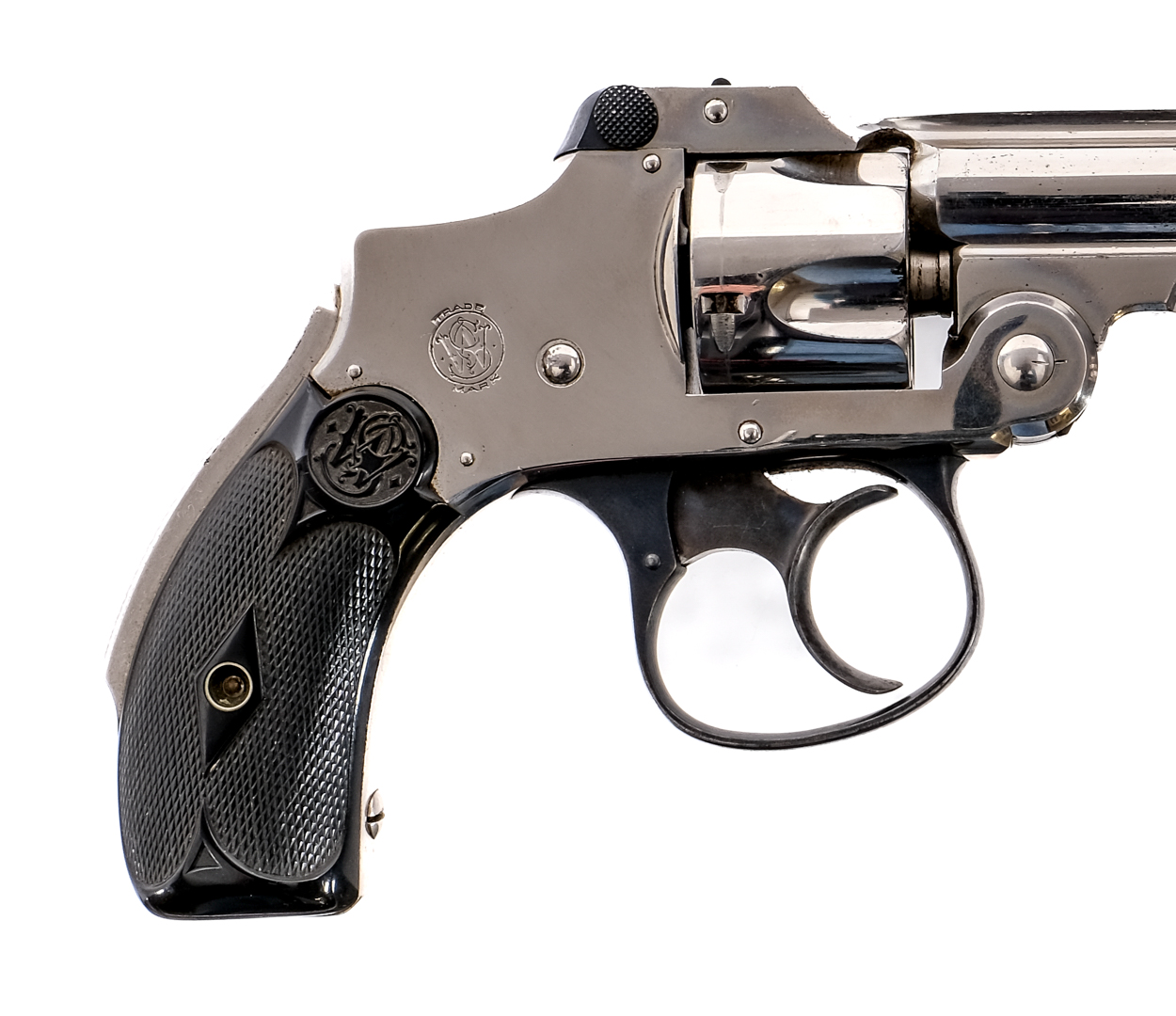Description Smith & Wesson Safety Hammerless 2nd Model in .32 S&W with a five round capacity and a 3″ barrel. Checkered composite grip plates. Nickel plated frame, cylinder and barrel. Blued trigger guard and checkered barrel tip down lever. Case colored trigger. Backstrap safety. Front and rear fixed sights. Must ship to a C&R or FFL holder. Condition: Very Good with light scratches and finish wear. Clean rifled bore. Barrel Length: 3″ Serial: 147825 Manufacturer: Smith & Wesson Caliber: .32 S&W Model: Safety Hammerless 2nd Model Year-Range 1902-1909 Book# 10-478