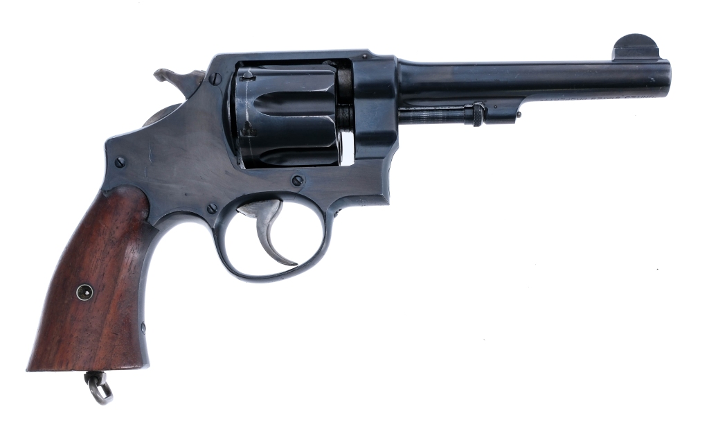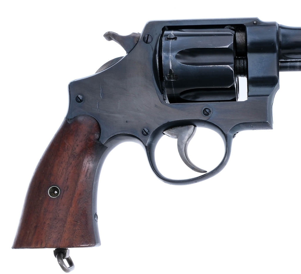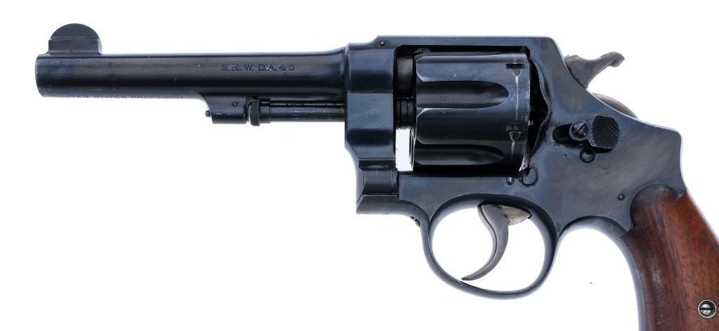 Description Smith & Wesson U.S. Army Model 1917 Double Action chambered in .45 ACP with a six-shot cylinder and a 5.5″ barrel. Blued barrel, frame, fluted cylinder, and checkered cylinder release. Case colored double action trigger and hammer. Smooth wood grips and metal lanyard loop. Rear notch and fixed front blade. The left side of the barrel is marked “S&W D A 45”. he underside of the barrel is marked “UNITED STATES PROPERTY”. The bottom of the frame is marked “U.S. ARMY MODEL 1917 No 92505”. Must ship to a C&R or FFL holder. Condition: Very Good with light scratches, sharp edge wear, and general cosmetic handling wear. Some finish thinning on the contact points. Metal contact marks on the bottom of the frame and trigger guard. Some finish wear near the muzzle. Cylinder turn line and light operational wear. Light scratches and dings on the grips. Bright and clean rifled bore. Barrel Length: 5.5″ Serial: 92505 Manufacturer: SMITH & WESSON Year: 1918 Caliber: .45 ACP Model: DA 45/ M1917 Book# 05688