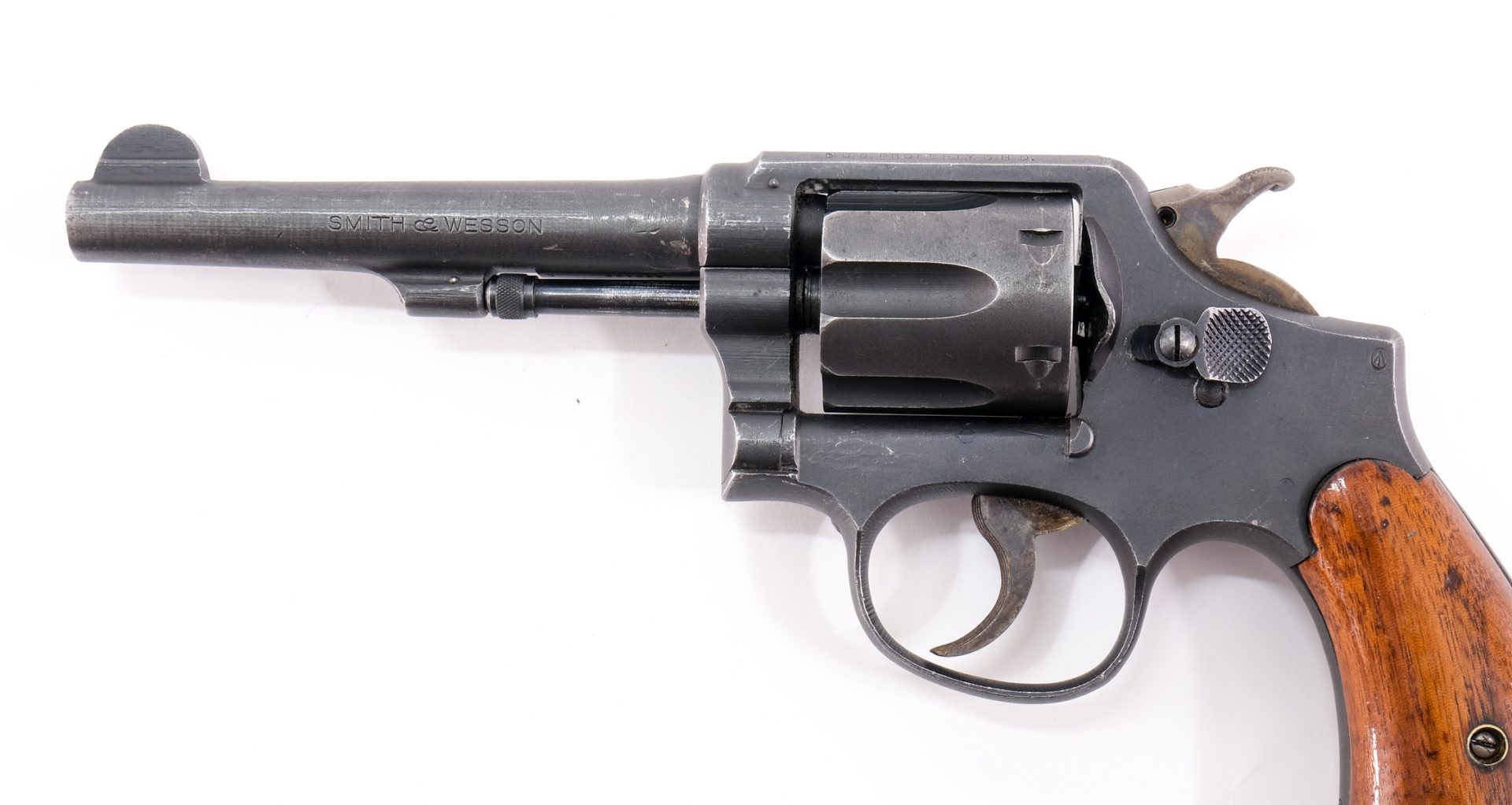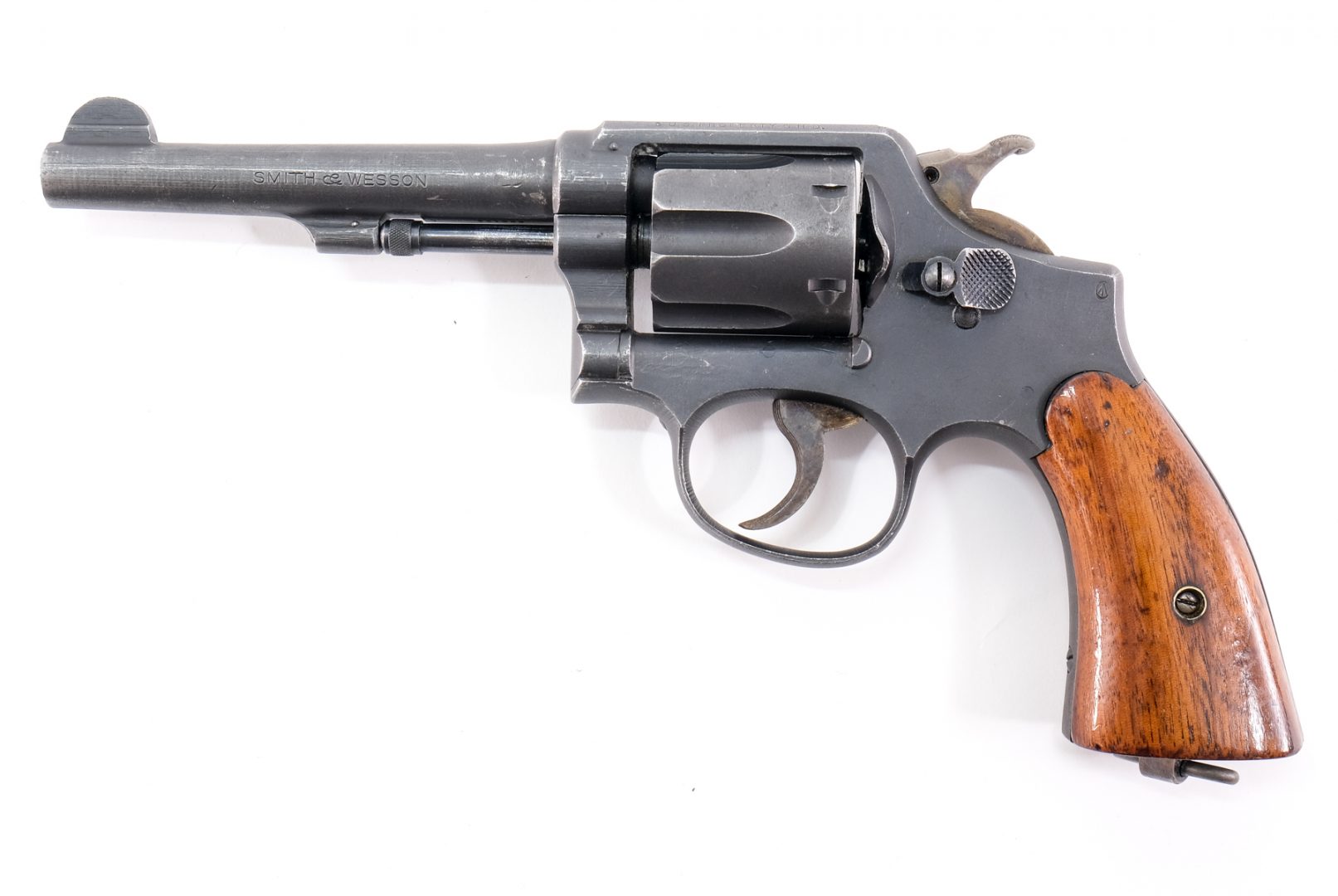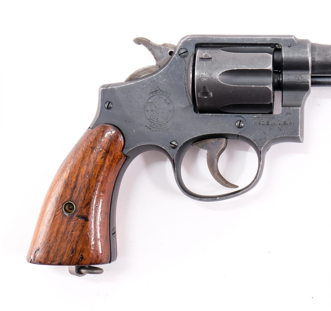 Smith & Wesson Victory 10 Lend Lease in .38 S&W with a six shot capacity and a 5″ barrel. Sandblasted parkerized factory finish. Case colored checkered hammer and serrated trigger. Solid American walnut wood grip plates with matching serial number. Fixed front blade iron sights. Lanyard loop on the heel. Right side of barrel, Navy marked with a “Anchor over a V” and “NP” (Nitro Proof) also a bomb with “CP” in the center. Left side of frame marked with a small “arrow inside a circle”. Right side of frame marked “Not English Made” a “small crown with a V” in the center. Inside the cylinder gate marked “AB 58740”. A small “P” on the heel opposite the serial number. Cylinder is marked in-between rounds with a small “Flaming Bomb”. Marked on the top of frame “U.S. Property G.H.D.” (Guy H. Drewry) which is the inspector for who did the ordinance acceptance mark. Under grips right side marked “P N H” “5”. Left side under grips marked “AB” “V”. All matching serial numbers on visible parts. Must ship to a C&R or FFL holder.