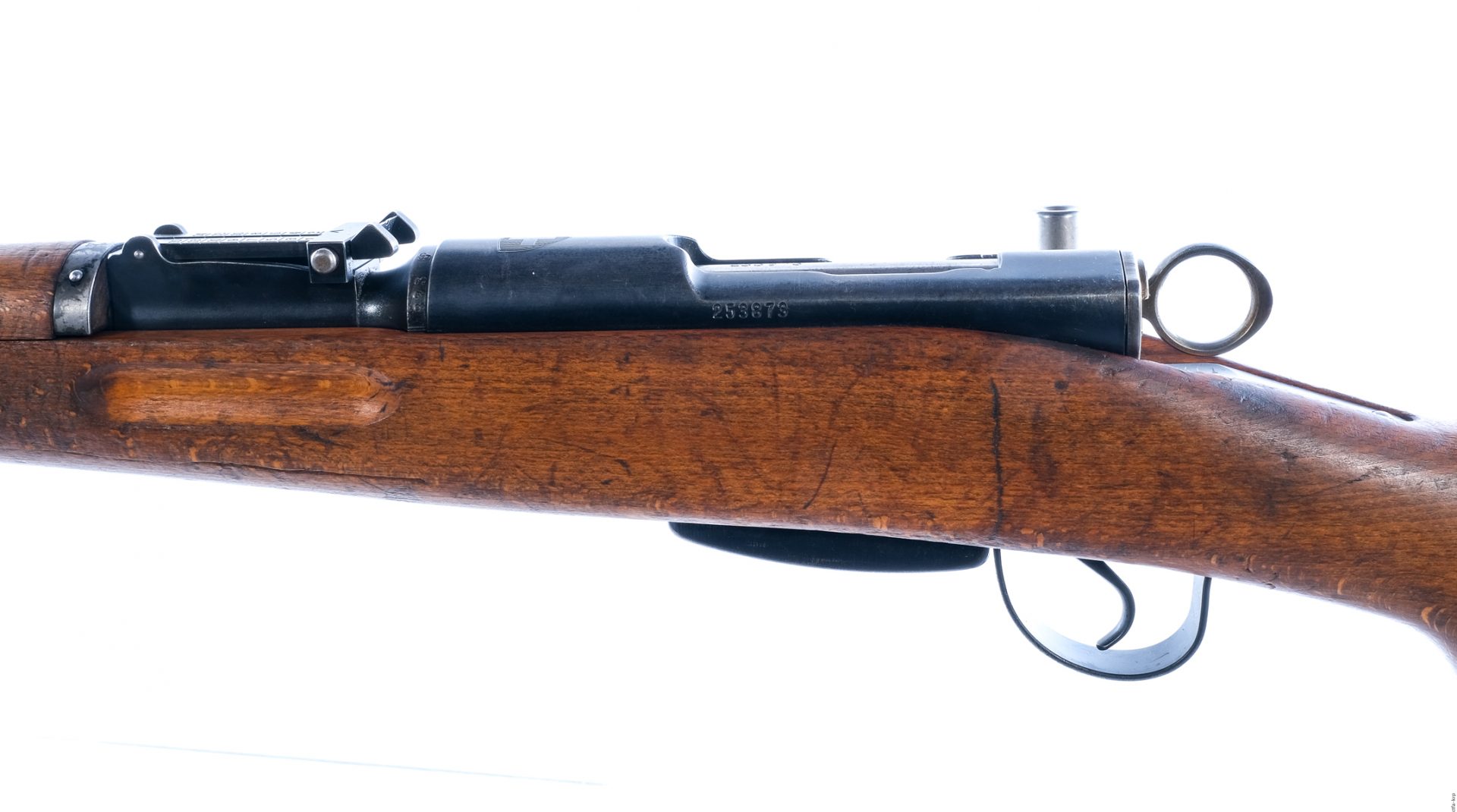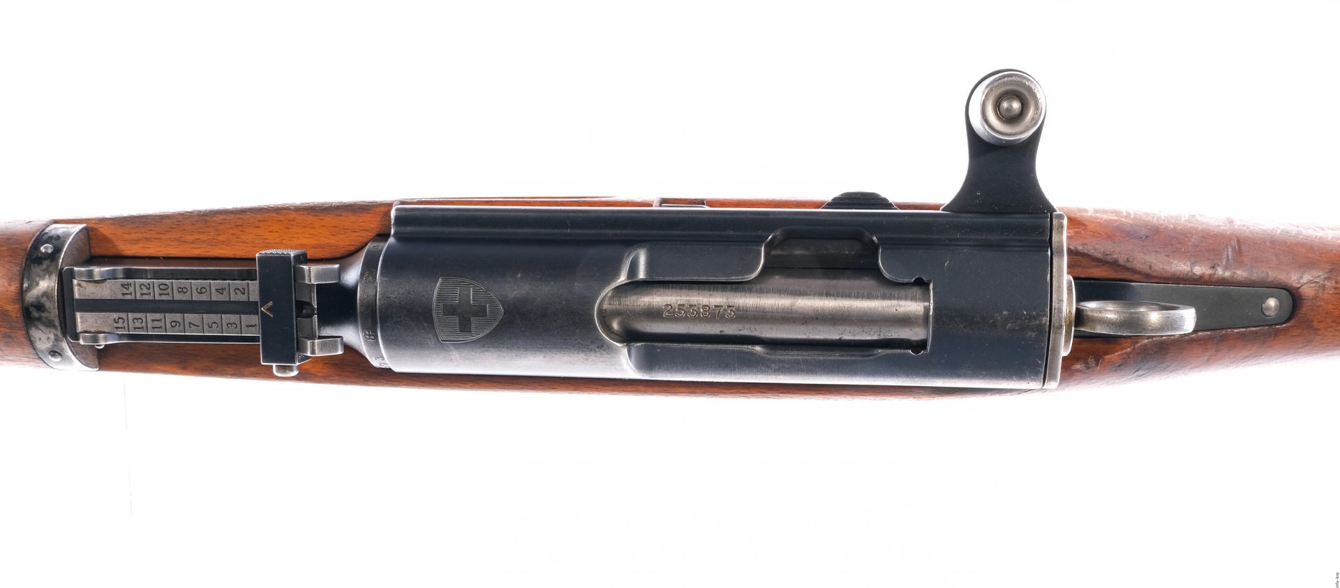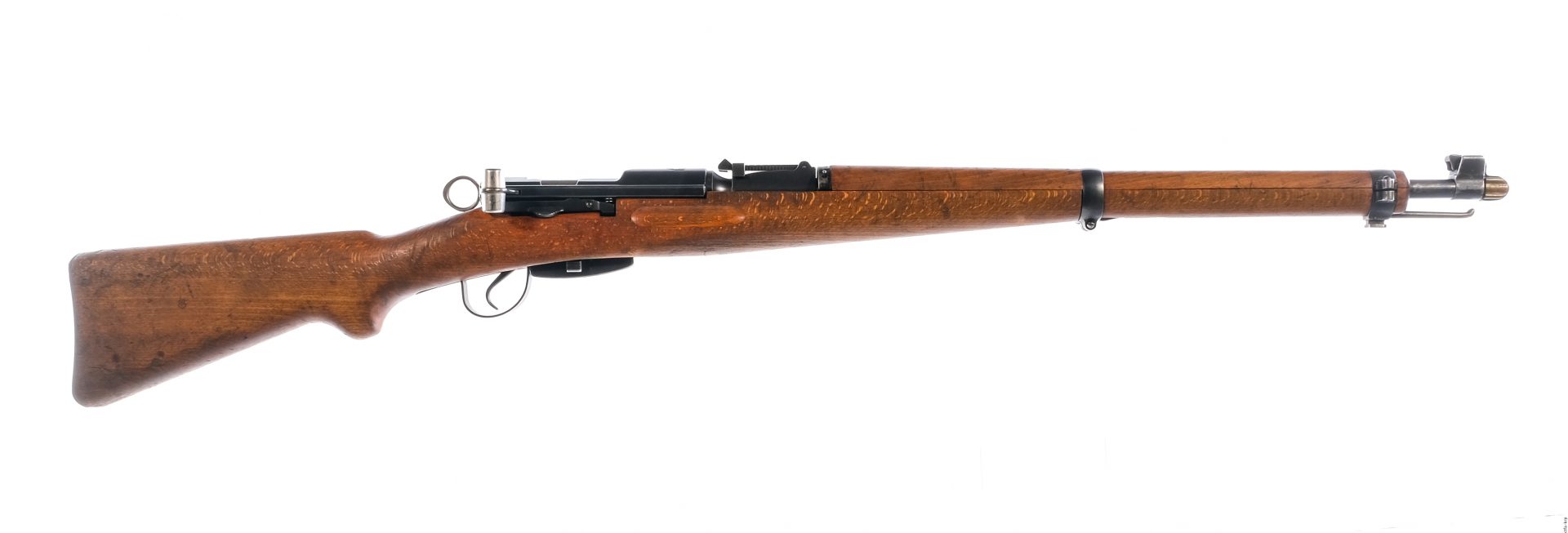 Description Waffenfabrik Bern Switzerland Karabiner 1931 in 7.5x55mm with one, six round removable magazine and a 24″ barrel. Import marked on the barrel at muzzle by PW Redmond Washington. Metal butt plate. Smooth wood stock and front foregrip. Blued trigger guard, trigger, magazine box, receiver and barrel. Right side of magazine box located magazine release. Rear receiver twist ring safety. Right side of receiver charging handle. Under barrel fixed bayonet lug. Under barrel stacking prong. Metal loops for mounting a shoulder sling. Rear flip up adjustable and front fixed blade sight. All visible numbers matching. Comes with brass muzzle cap. Must ship to a C&R or FFL holder. Condition: Very Good with scratches, wood dings and handling wear. Clean rifled bore. Barrel Length: 24″ Serial: 253873 Manufacturer: Waffenfabrik Bern Year: 1931 Caliber: 7.5x55mm Model: K31 Book# 510