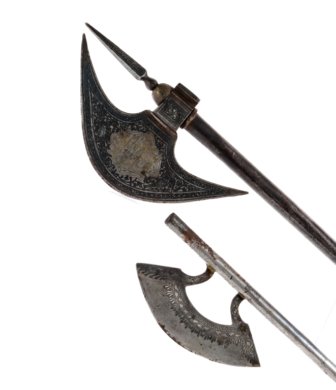Description This lot is for two Indonesian/Persian Tabar Axes. The smaller of the two is 23 1/4″ long with a 7″ blade. Hollow steel handle with inlay accents. Blade has inlaid accents. The larger of the two has a 31 1/4″ length with a 10″ blade. Hollow Damascus handle with gold inlaid blade with inlaid spike and hammer face/sides. Ships to all buyers home. Condition: Good with scratches, dings, light damage, rust and finish wear. The larger axe is a little bit loose at the blade and handle point. Manufacturer: India Persia Ottoman Model: Tabar Axe