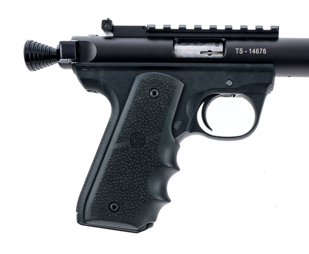 Description Tactical Solutions Pac-Lite 22/45 chambered in .22 long rifle with three, ten round magazines and a 6″ barrel, including the muzzle break. Alloy/polymer 22/45 frame with pebble textured Hogue rubber grips. Frame mounted bolt release and manual safety. Black finished barrel and upper, drilled and tapped with mounted optics rail. Adjustable rear sight and red fiber optic front sight. Rear serrated bolt charging ears with aftermarket extension. Must ship to a FFL holder. Condition: Fair mainly due to the trigger not fully resetting correctly, depending on the position of the pistol when charged. Cosmetically very good with light handling and operational wear. Clean bore with strong rifling. Sold AS-IS. due to the trigger issues. Barrel Length: 6″ Serial: TS-14676 Manufacturer: TACTICAL SOLUTIONS, INC. Caliber: .22 Long Rifle Model: Pac-Lite 22/45 Book# 07854