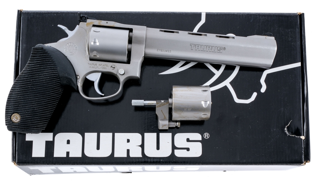 Description Taurus model 992 Tracker double action revolver in .22 Long Rifle/.22 Magnum with a nine round capacity and a 6.5″ barrel. Taurus serrated rubber wrap-around grip. Matte finished frame, cylinder and barrel. Smooth wide metal trigger and knurled hammer. Left side of frame knurled cylinder release. Rear adjustable and front fixed red ramp sight. Comes in its factory box with matching serial number, instruction manual, .22 Mag cylinder and Taurus hammer locking keys. Must ship to FFL holder. Condition: New old stock in box, some light handling wear and dried oil from storage. Barrel Length: 6.5″ Serial: EY520453 Manufacturer: TAURUS INTERNATIONAL MFG. Caliber: .22 Long Rifle, .22 Magnum Model: 992 Tracker Book# 08015