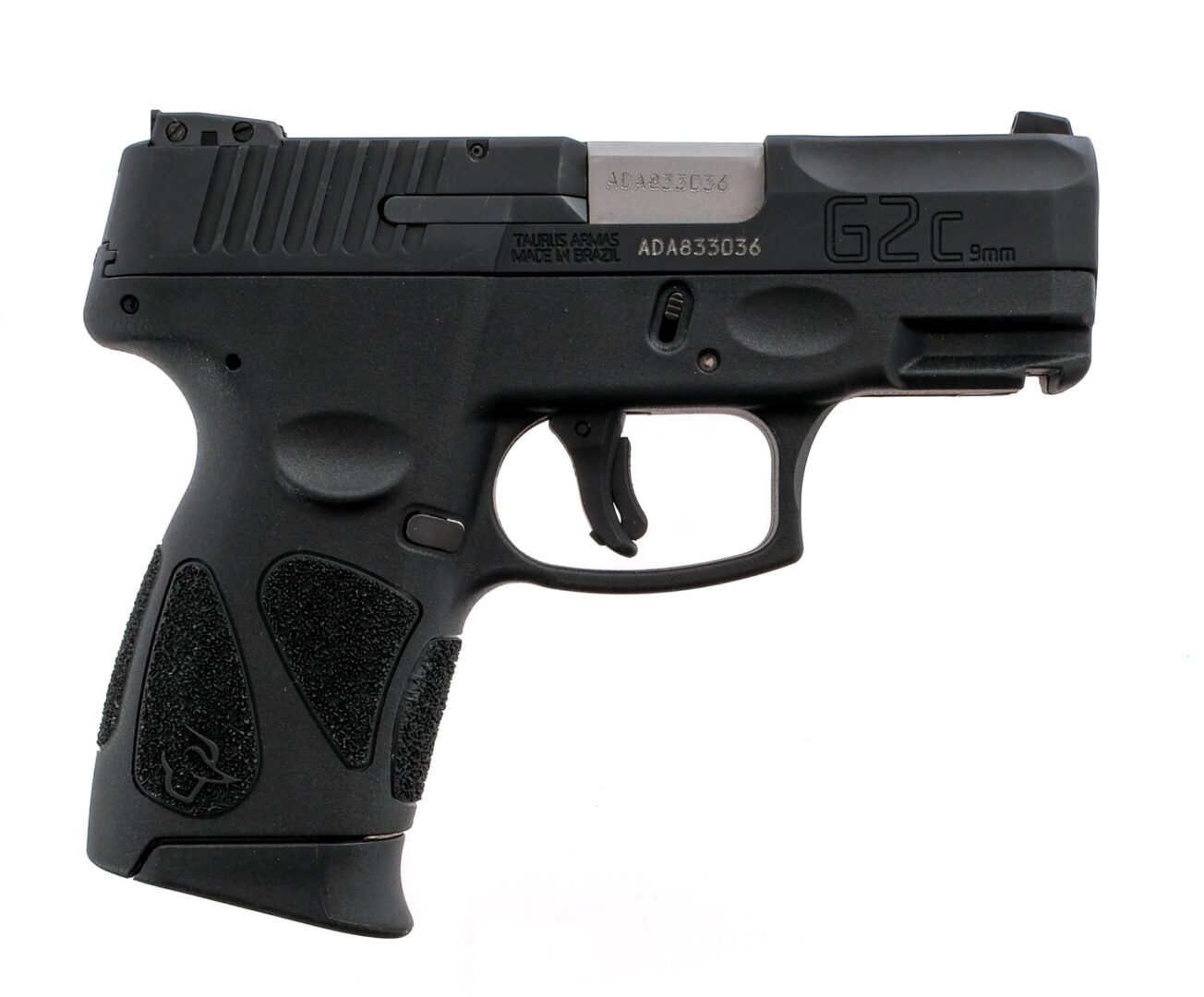 Description Taurus G2C chambered in 9mm with one, ten round removable magazine and a 3.2″ barrel. Textured polymer frame with under barrel accessories rail. Polymer single action trigger with Re-strike capability and trigger safety. Manual thumb safety. Matte finished alloy steel serrated slide. Loaded chamber indicator. White three-dot adjustable rear sight and fixed front blade. Comes in its factory box with factory paperwork, cable lock, and one magazine. Must ship to a FFL holder. Condition: Very Good/Excellent with light scratches and wear from normal handling and operation. Clean rifle bore. Barrel Length: 3.2″ Serial: ADA833036 Manufacturer: TAURUS INTERNATIONAL MFG. Caliber: 9x19mm Parabellum Model: G2C Book# 03251