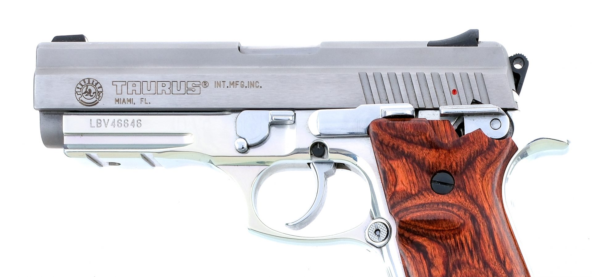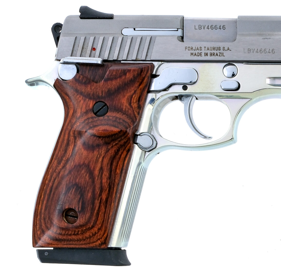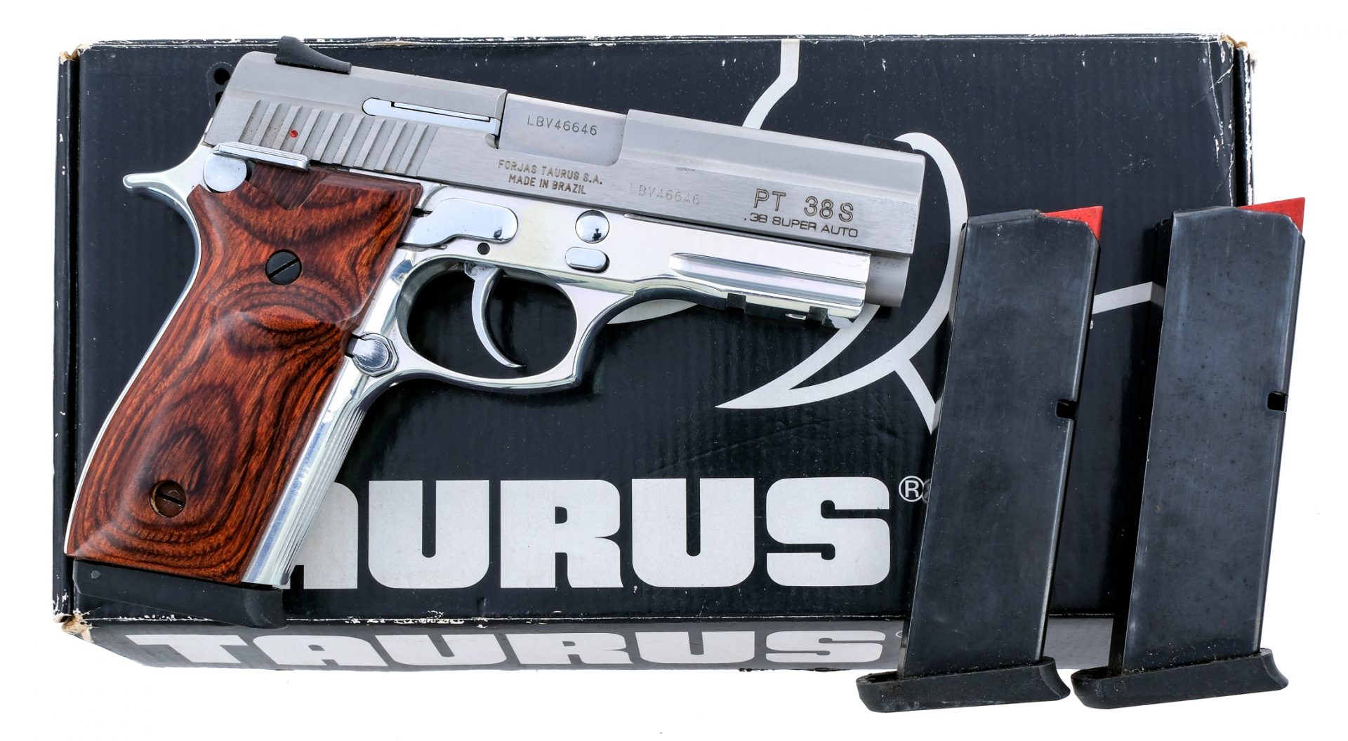 Description Taurus PT-38S in .38 Super with three, ten round removable magazines and a 4.25″ barrel. Made in Brazil. Aftermarket smooth wood grip plates. Polished alloy frame. Polished serrated stainless steel slide. Polished trigger and blued hammer. Lower left side of frame checkered magazine release button. Left side of frame take-down lever and slide release. Rear frame ambidextrous safety switch. Front and rear fixed white dot sights. Backstrap has Taurus Security System that with included keys locks the mechanism. Comes in its factory box with matching serial number, three magazines, original composite grip plates, cleaning brush, instruction manual and Taurus keys. Must ship to a FFL holder. Condition: Excellent with light scuffs and handling wear. Clean rifled bore. Barrel Length: 4.25″ Serial: LBV46646 Manufacturer: Taurus Caliber: .38 Super Model: PT 38S Book# 06220
