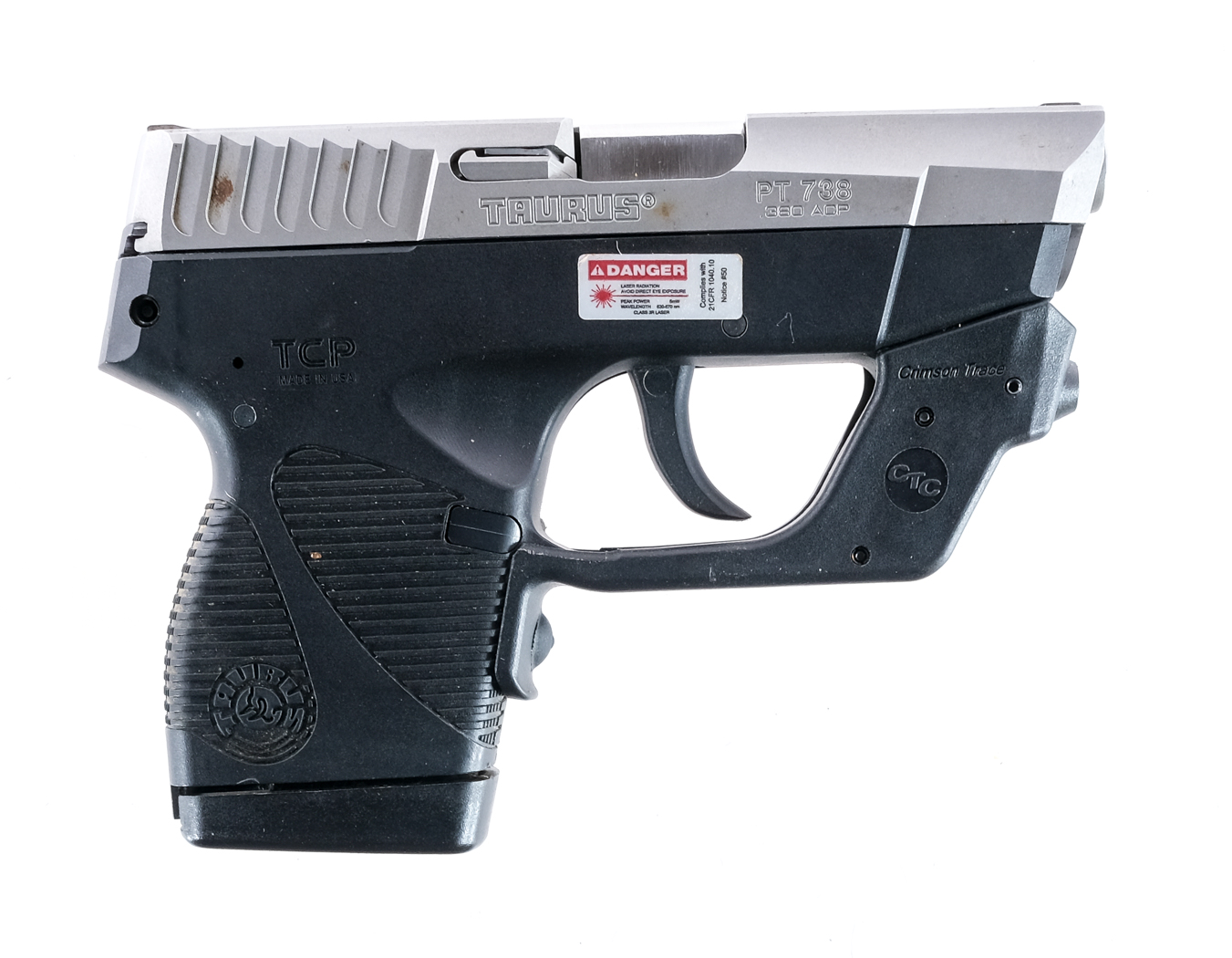 Description Taurus PT738 in .380 with one, six round removable magazine and a a 2.75″ barrel. Serrated composite grip on frame. Serrated metal slide. Untextured composite trigger. Left side of frame serrated slide release. Lower left side of frame serrated magazine release. Front trigger guard, Crimson Trace laser, working. Front and rear fixed sights. Must ship to a FFL holder. Condition: Good with scuffs, touches of rust on the slide and handling wear. Clean rifled bore. Barrel Length: 2.75″ Serial: 11389A Manufacturer: Taurus Caliber: .380 Model: PT 738 Book# 9-344