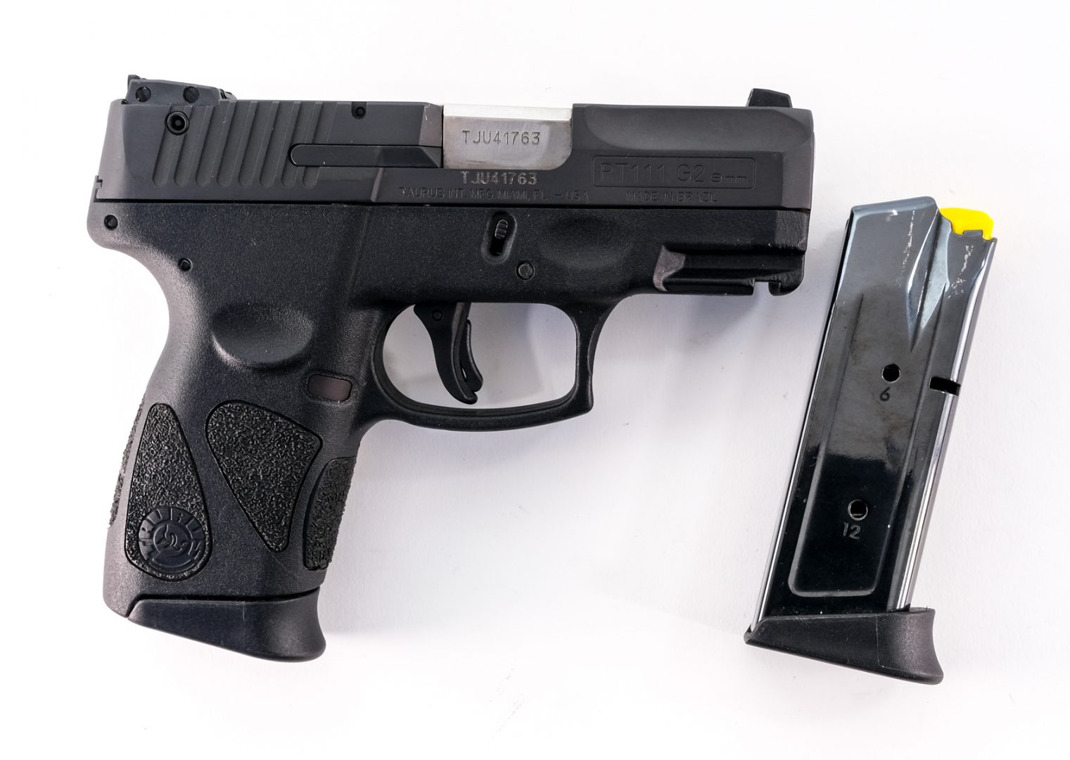 Description Taurus PT111 Millennium G2 in 9mm with two, twelve round removable magazines and a 3″ barrel. Composite grip and frame. Left side frame safety switch and trigger safety. White 3-dot sights with rear adjustable and front fixed blade. Front frame rail for mounting accessories. Loaded chamber indicator on the top of slide. Comes with two, twelve round magazines with finger extension. Check “High Capacity” magazine legal in your location. Must ship to a FFL holder.