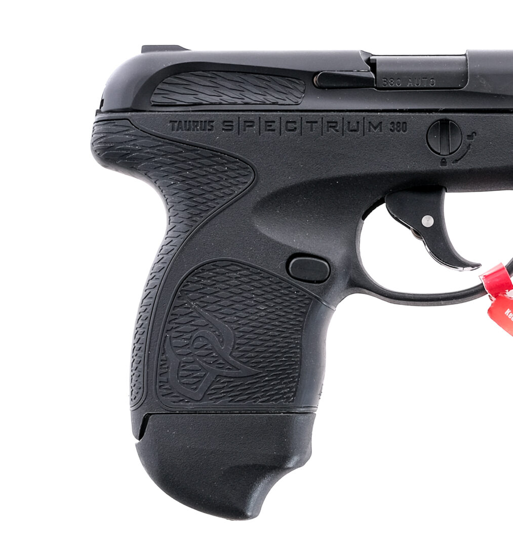 Description Taurus Spectrum 380 semi-automatic pistol chambered in .380 caliber with a 2.8″ barrel and two, 6 round removable magazines. Black polymer frame with rubber checkered grip. Black metal barrel and slide with rear rubber checkering. Smooth polymer trigger. Left side slide stop. Left side checkered magazine release. Fixed notch iron sights. The second magazine has an extended plate for a pinky extension. Comes in its matching factory box with gun lock. Must ship to FFL holder. Condition: Excellent condition with extremely minor handling/shooting wear. Clean rifled bore. Barrel Length: 2.8″ Serial: 1F125827 Manufacturer: TAURUS INTERNATIONAL MFG. Caliber: .380 ACP Model: Spectrum 380 Book# 01075