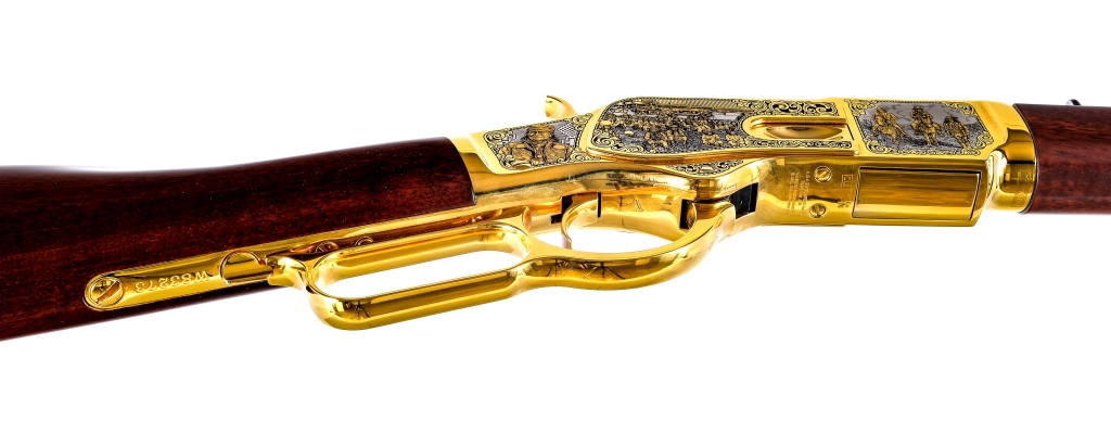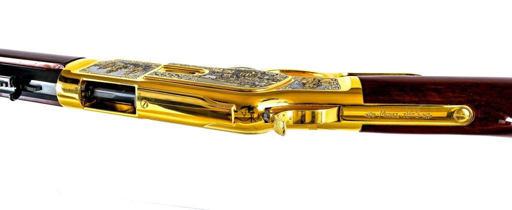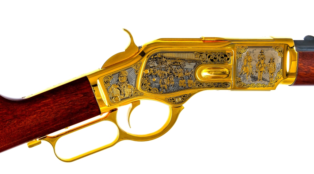 Description Taylors & Company/A. Uberti Winchester Model 1873 Geronimo Tribute Rifle in .45 Colt with a ten round capacity and a 20″ octagon barrel. This one is 61 of 500 ever made in 2019. Made by Taylors/Uberti in Italy, sold by America Remembers Inc and engraved by A&A Engraving Inc. Gold finished butt plate. Smooth wood stock and front forend. Gold finished hand lever, trigger, hammer, receiver and front end cap. Blued magazine tube and barrel. Right side of receiver loading gate. Rear adjustable and front fixed blade sight. Deep laser engraved receiver with Geronimo photo scenes and scrollwork. Must ship to a FFL holder. Condition: Like New with light handling wear. Clean rifled bore. Barrel Length: 20″ Serial: W83273 Manufacturer: Uberti Taylors Year: 2019 Caliber: .45 Colt Model: 1873 Geronimo Tribute Book# 08214