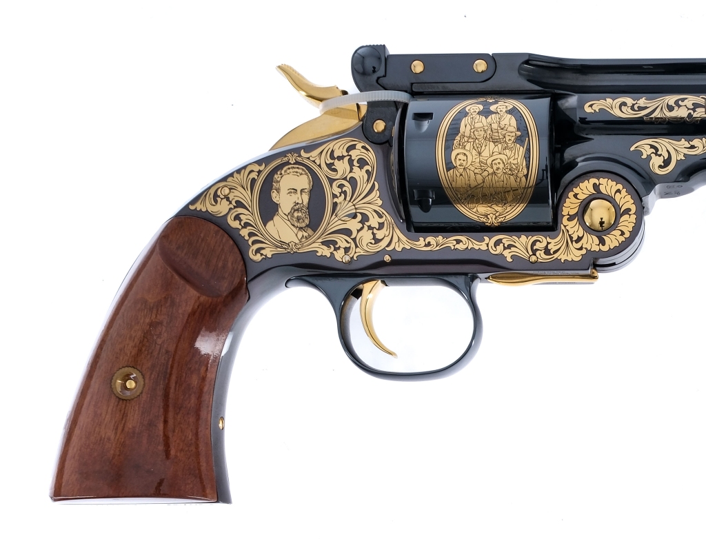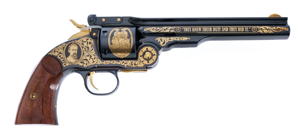 Description Taylors/Uberti Texas Ranger Tribute Schofield in .44 WCF ( .44-40 ) with a six round capacity an a 7″ barrel. This revolver is number 74 of 500 ever made. America Remembers, Licensed by Texas Ranger Hall of Fame and Museum, A&A Engraving Inc, tribute revolver. Smooth high gloss finished wood grip plates. Engraved and gold gilded blued frame, cylinder and barrel. Gold finished trigger and hammer. Rear notch and front fixed blade sight. Comes in a box with matching serial number tag on the top from a dealer and factory Certificate of Authenticity. Must ship to a FFL holder. Condition: New with box. Clean rifled bore. Barrel Length: 7″ Serial: F20732 Manufacturer: Taylors Uberti Caliber: .44-40 Model: Texas Ranger Tribute Schofield Book# 08229