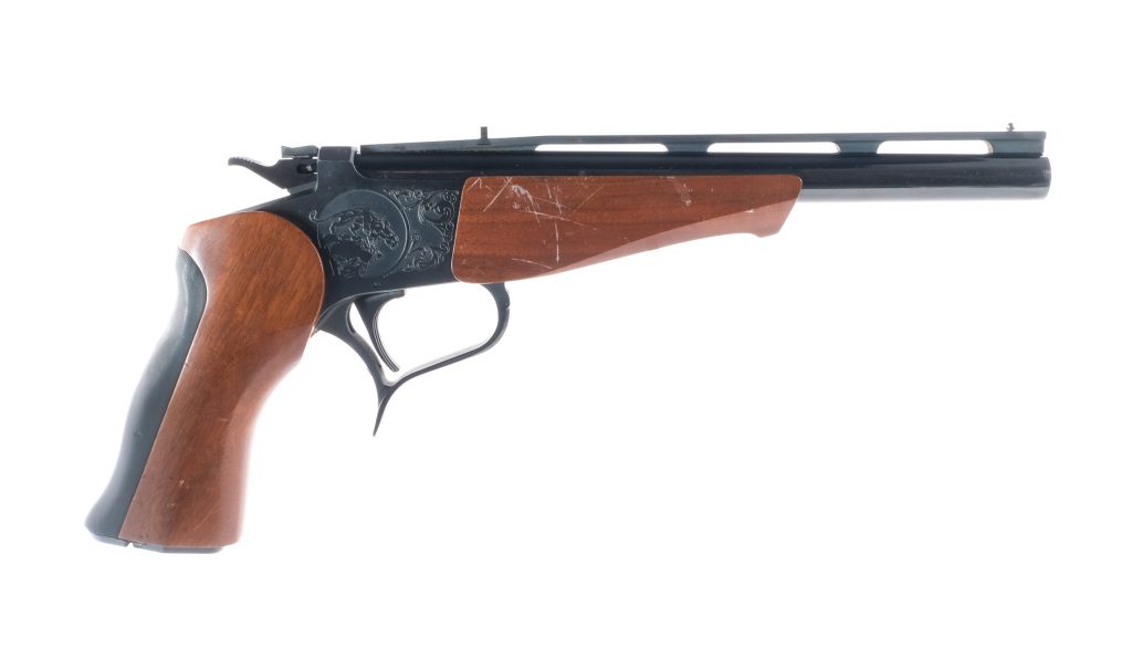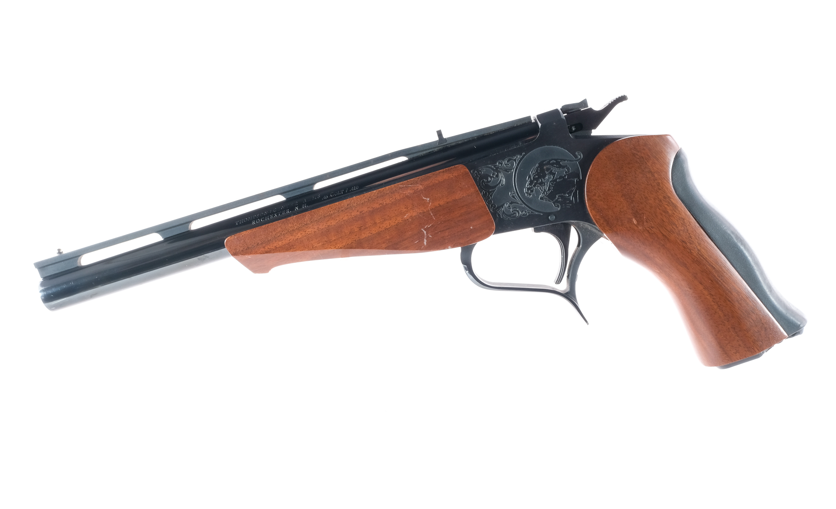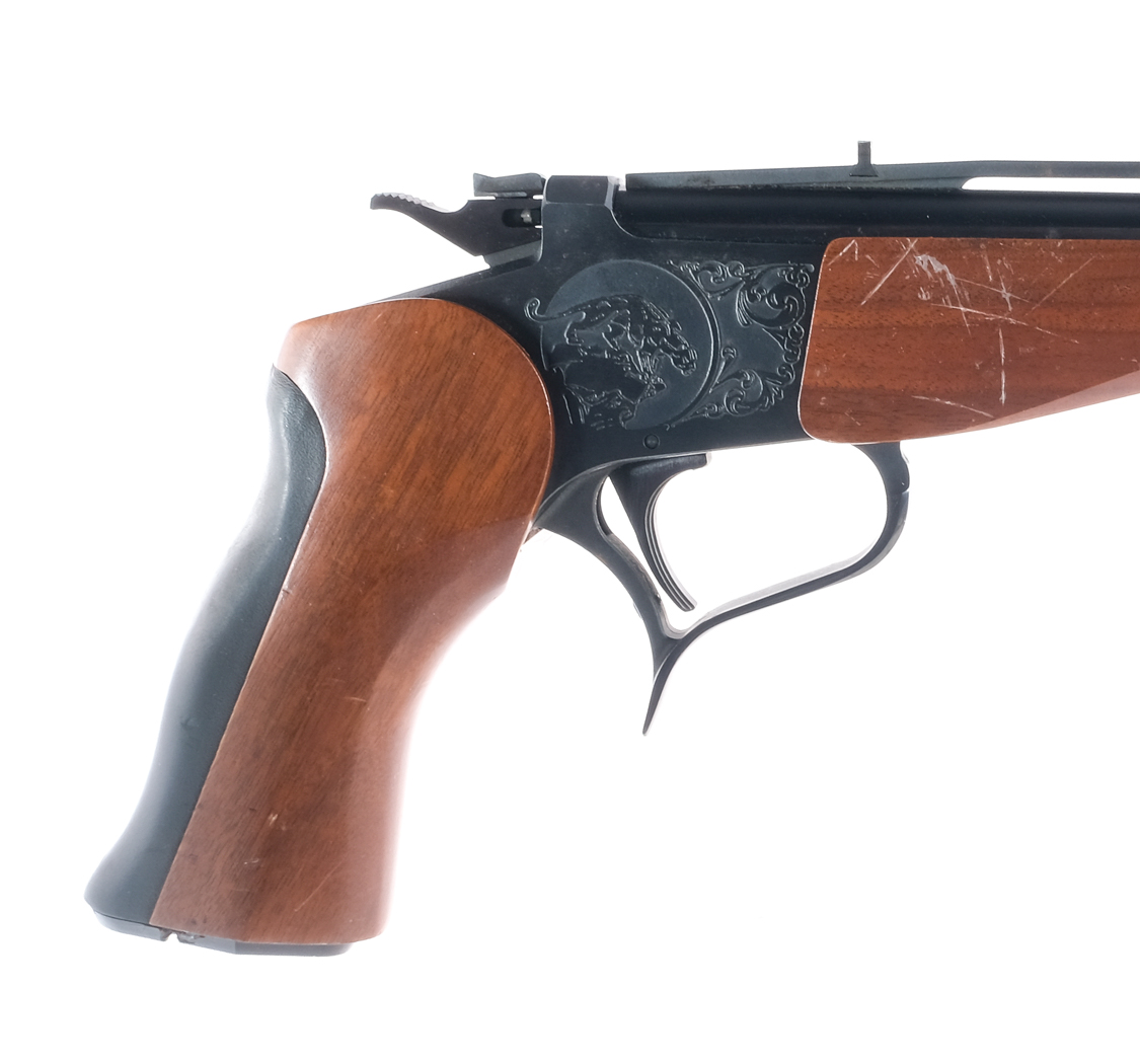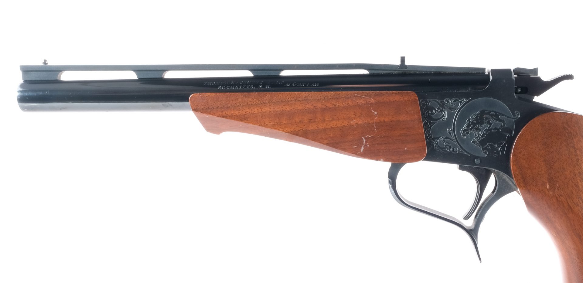 Description Thompson Center Contender Pistol in .45 Colt or .410 shotgun with a single round capacity and a 10″ top rib vented barrel. Smooth rubber and wood grip plate. Blued hand lever, serrated trigger, serrated hammer, frame and barrel. Rear hammer safety. Front and rear fixed sights. Must ship to a FFL holder. Condition: Good/Very Good with light scratches and the pistol grip plate has been broken. Clean rifled bore. Barrel Length: 10″ Serial: 348805 Manufacturer: Thompson Center Arms Gauge: 410 Caliber: 45 Model: Contender Book# 9-590