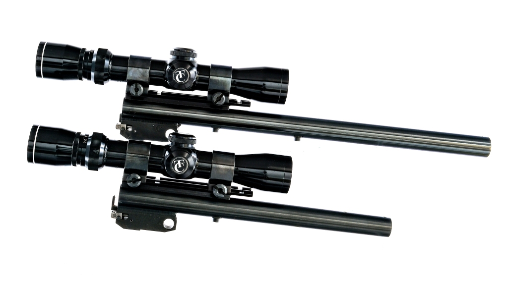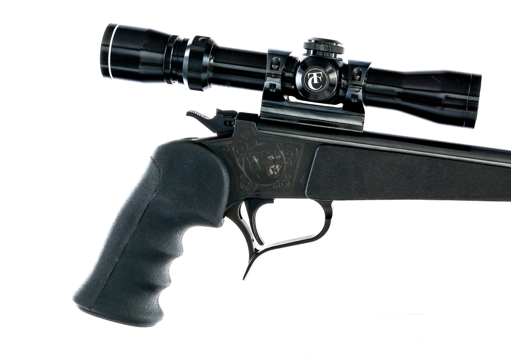 Description Thompson Center chambered in .22 Hornet with a single round capacity and a 14″ barrel. Composite grip with finger grooves. Blued barrel, receiver, trigger, hammer, and barrel release lever. Front fixed blade sight. Top of barrel mounted Thompson Center 2.5x-7×28 scope with clear glass and a duplex reticle. The hammer has a switch to change from centerfire to rimfire rounds. Comes in its soft factory zipper case with two extra barrels, one in .30-30 Winchester “Super 14″ with a 14″ length and TC scope. The other in .22 Long Rifle Match with a 10″ length and TC scope. Includes tool and pin. Must ship to FFL holder. Condition: Very Good/Excellent with light scuffs and handling wear. Clean rifled bores. Barrel Length: 14″ 14″ 10” Serial: 458322 Manufacturer: Thompson Center Arms Caliber: .22 Hornet .22 LR .30-30 Win Model: Contender Book# 08105
