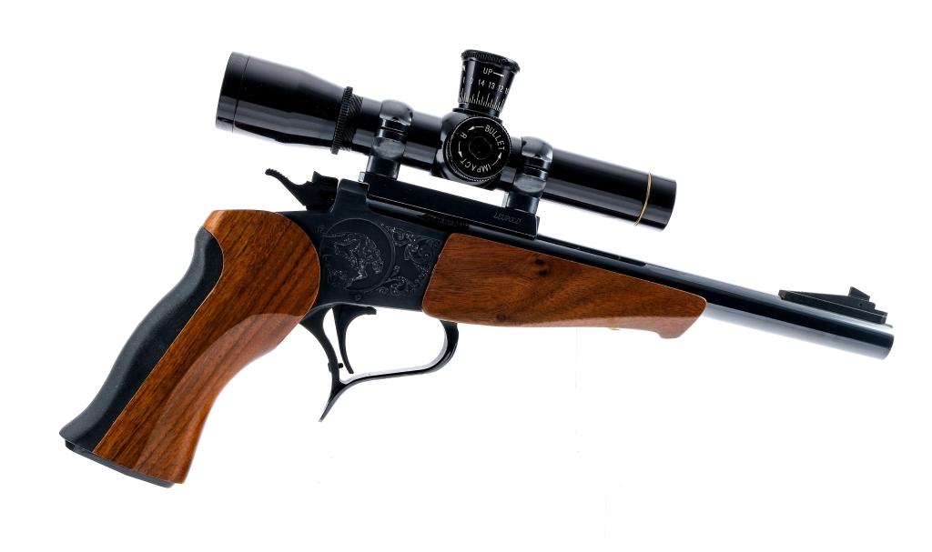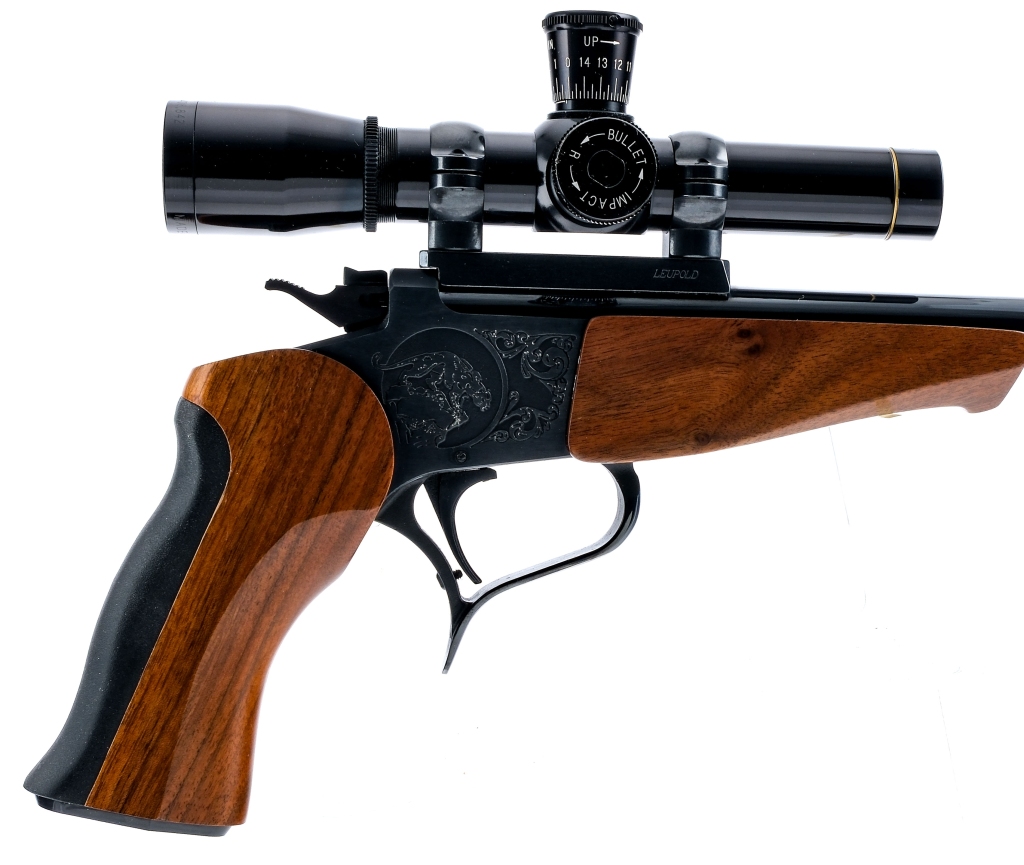 Description Thompson Center Contender chambered in .22 long rifle with a single-shot capacity and a 10″ match barrel. Blued barrel, frame, lever, trigger, and hammer. Hammer mounted safety lever. Smooth wood pistol grip with rubber backstrap, and smooth wood forend. Fixed front blade. The barrel is drilled and tapped and mounted with a Leupold M8-2x Extended scope. Must ship to a FFL holder. Condition: Very Good/Excellent with light handling and operational wear. Clean bore with strong rifling. Barrel Length: 10″ Serial: 391757 Manufacturer: THOMPSON/CENTER ARMS CO., Caliber: .22 Long Rifle Model: Contender Book# 07990