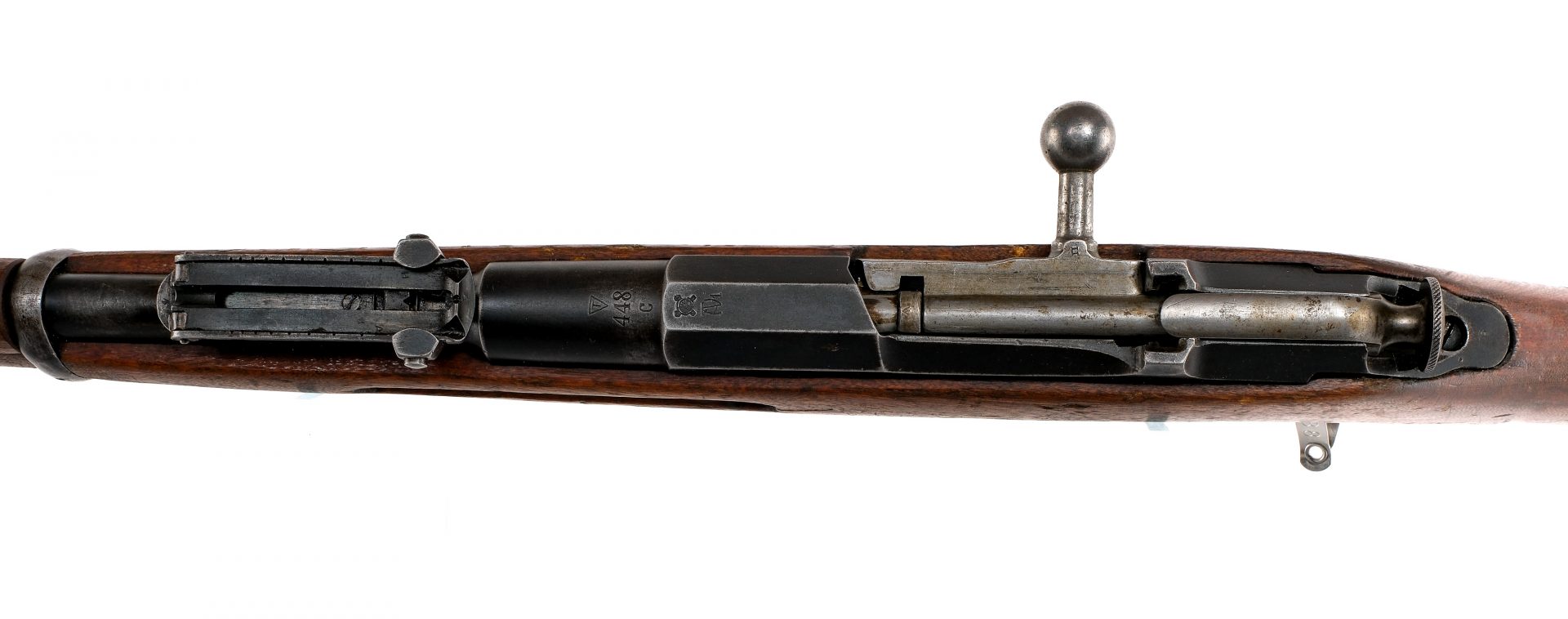 Description Finnish Tikka made M91 Mosin Nagant chambered in 7.62x54r with a five round internal magazine and a 30.5″ barrel. Imported by CAI ST Albans, marked on the barrel. Blued finish with Tikka barrel shank and hexagon receiver. Unfinished bolt with knob safety. Konovalov curved rear sight with crossed out graduations, and barleycorn front sight blade. Wood top and bottom forend with cleaning rod. Wood straight grip stock with metal butt plate. Front and rear sling slots. The top of the barrel shank is marked with T in triangle for Tikka and “448 c”. The hex receiver is marked with gearwheel/cross cannons stamp and ATV1 mark. Many of the parts are missing their serial numbers or non matching. Must ship to a FFL or C&R holder. Condition: Good with varying spots of finish loss/in the white, spots of patina and metal oxidation/pitting. Scratches, scuffs, dings, and heavy gouges in the wood. Bright and clean bore with strong rifling. Barrel Length: 31.5″ Serial: 448c Manufacturer: Tikka Caliber: 7.62 x 54R Model: M91 Mosin Nagant Book# 04002