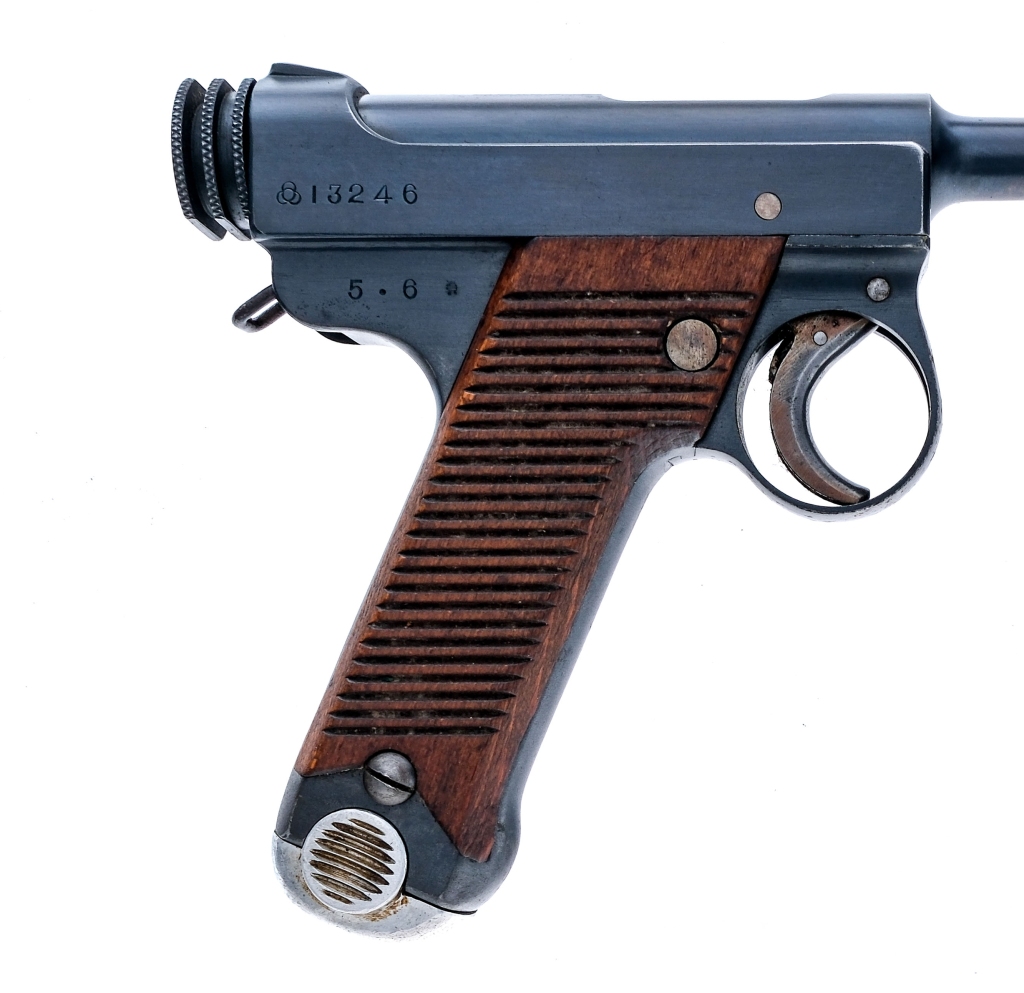 Description Japanese Nambu “Original Series” Type 14 in 8x33mm with two, eight round removable magazine and a 4.5″ barrel. Made in the Tokyo Arsenal in June of 1930. Serrated wood grip plates. Blued trigger guard, frame, charging handle and barrel. Straw finished trigger and safety switch. Left side of frame checkered magazine release. Rear frame lanyard loop and checkered charging handle. Front and rear fixed sights. Matching serial number on bolt and frame. Mismatched serial on magazines. Comes in a period leather belt holster with cleaning rod, two springs and magazine safety with matching serial number to gun. Must ship to a C&R or FFL holder. Condition: Very Good with light scuffs and handling wear. Clean rifled bore. Barrel Length: 4.5″ Serial: 13246 Manufacturer: Tokyo Arsenal Year: 1930 Caliber: 8×22 Nambu Model: Type 14 Book# 08439