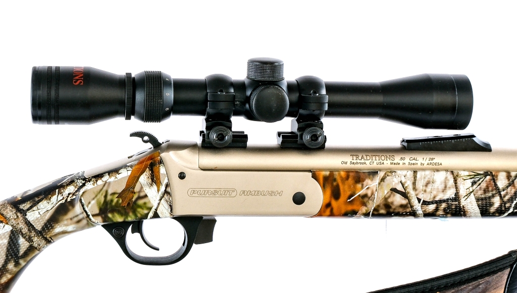Description Traditions Pursuit Ambush in .50 caliber with a single round capacity and a 26″ rifled barrel. Rubber butt pad. Checkered composite stock with Next G-1 Vista camo print. Blued trigger and hammer. Silver finished receiver and barrel. Rear trigger guard push button safety. Front trigger guard barrel tip up button. Under barrel cleaning/ramrod. Missing rear adjustable riser and front fiber optic fixed is broken. Receiver mounted with a Traditions 3-9×32 scope with clear glass and a duplex reticle. Comes with a Brute nylon padded shoulder sling. Black Powder, No FFL required and ships to MOST buyers home. Condition: Like New with light handling wear. Clean rifled bore. Barrel Length: 26″ Serial: 14-13-006396-10 Manufacturer: Traditions Caliber: .50 Model: Pursuit Ambush