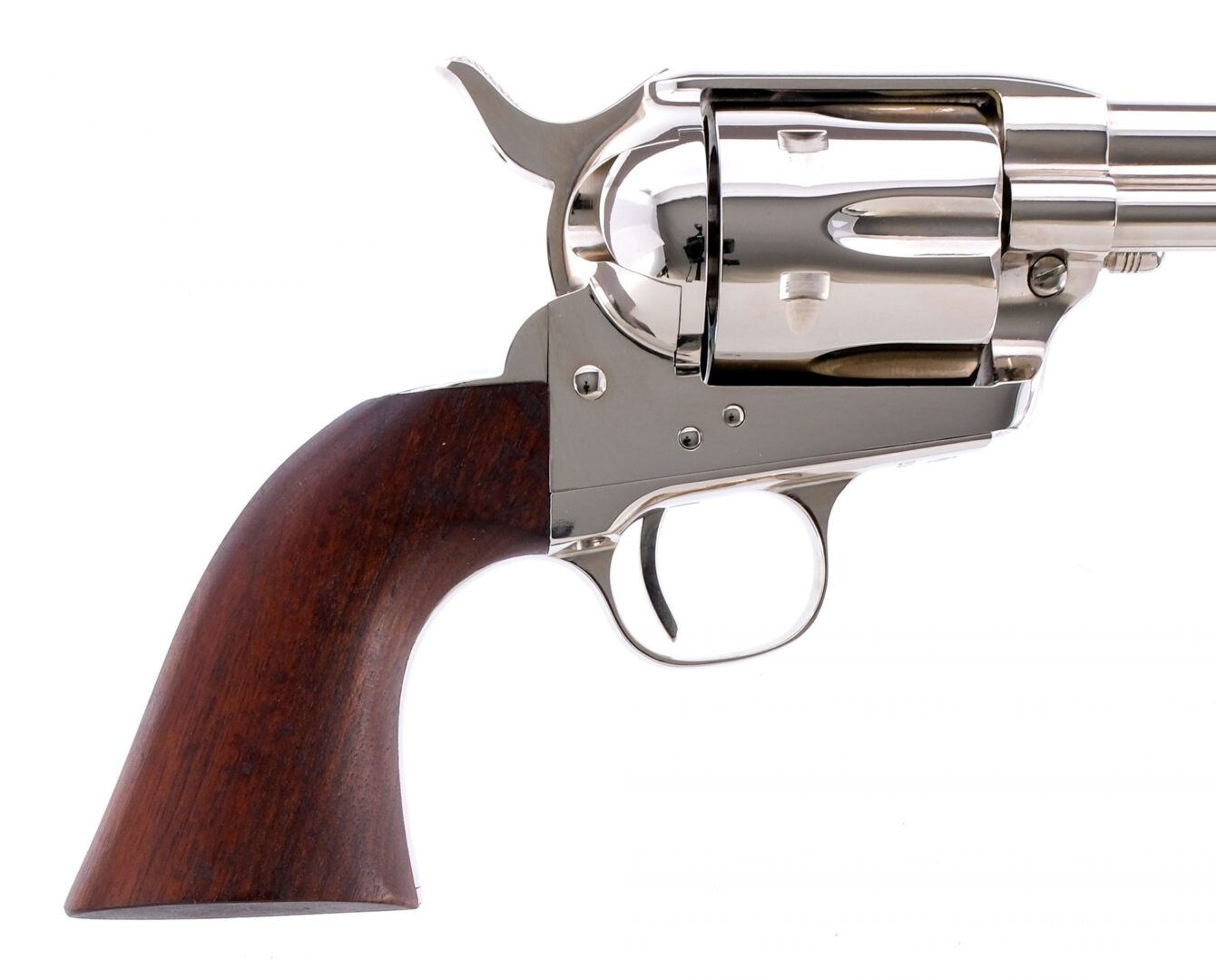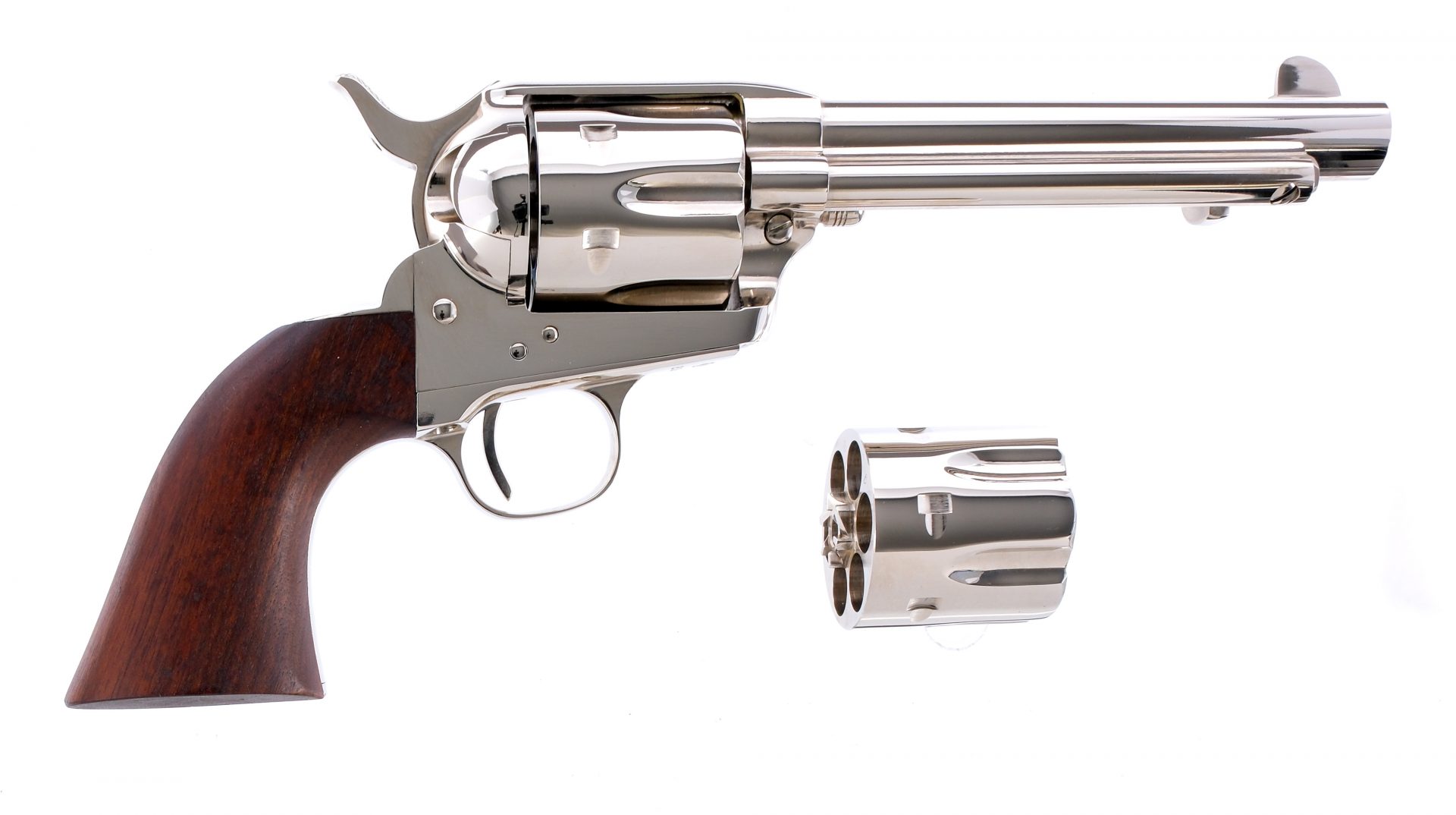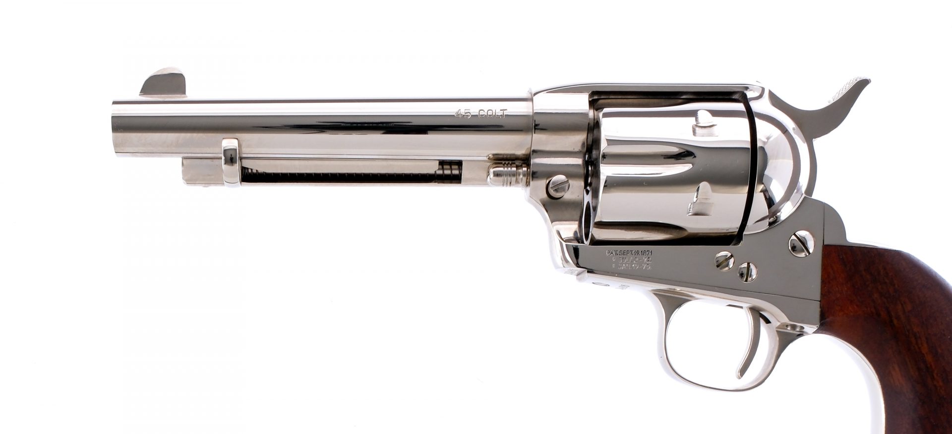 Description U.S. Fire Arms Manufacturing Company “Colt” Single Action Army chambered in .45 Colt and .45 ACP with two six round cylinders and a 5.5″ barrel. One cylinder is chambered in .45 Colt and the other is in .45 ACP, both are serial number matching to the revolver. Nickel finished barrel, frame, fluted cylinders, single action trigger, and hammer. Smooth wood grips. Front blade and rear notch iron sights. Serial number matching frame, trigger guard, grip frame, and cylinders. Comes in its factory box with manual, warranty card, and two cylinders. Must ship to a FFL holder. Condition: Very good/Excellent with some small light scratches on the finish from normal handling/operation. Clean rifled bore. Barrel Length: 5.5″ Serial: 20465 Manufacturer: UNITED STATES FIRE ARMS M Caliber: .45 Colt/ACP Model: Single Action Army Book# 03634