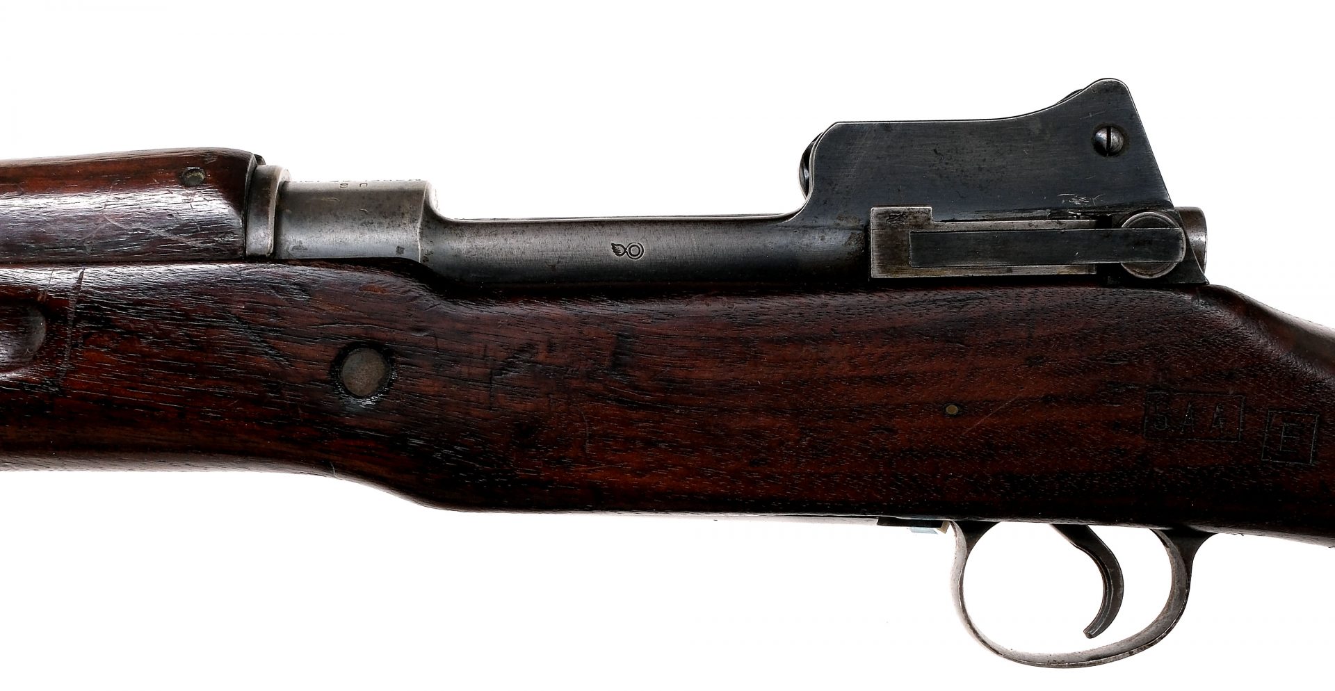 Description U.S. Remington Model 1917 (American Enfield) in .30-06 Springfield with a six round capacity and a 26″ barrel. Metal butt plate with intact cleaning/oiler tube inside. Smooth walnut stock. Blued trigger guard, serrated trigger, bolt, receiver and barrel. Rear right side of receiver safety switch. Rear left side of receiver bolt release. Under barrel fixed bayonet lug. Rear flip up adjustable peep hole and front fixed blade sight. Muzzle end of barrel marked: R 4-18 with Springfield Armory bomb proof. Underside of stock proofed with P. Left side of stock marked: S.A.A. E. Mounted with a canvas shoulder sling, unmarked. Must ship to a C&R or FFL holder. Condition: Good with light scratches, finish wear/loss and handling wear. Clean rifled bore. Barrel Length: 26″ Serial: 479291 Manufacturer: Remington Year: 1918 Caliber: .30-06 Sprg Model: 1917 Enfield Book# 04062