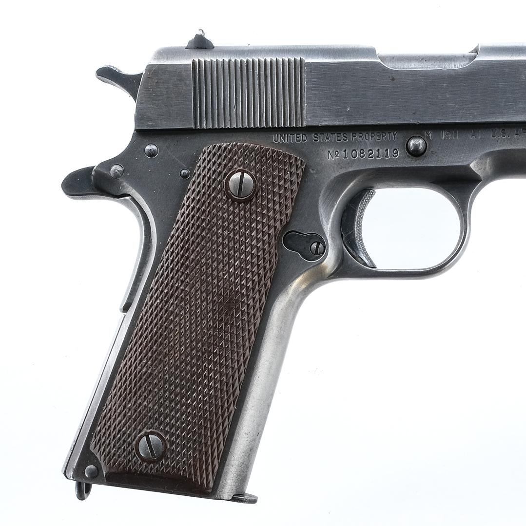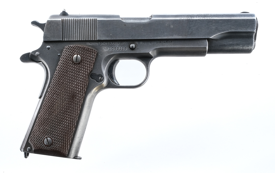 Description United Switch & Signal Company 1911 A1 in .45 caliber with one, seven round removable magazine and a 4.75″ barrel. Checkered brown composite grip plates with a Star K on the back of each with 8 on the back of one and 13 on the other. Worn blued frame, checkered solid trigger, checkered hammer, serrated slide and barrel. Magwell located lanyard loop. Backstrap safety. Lower left side of grip checkered magazine release. Left side of frame serrated slide release and slide stop safety. Left side of frame has R.C.D. proof for the Military inspector LT Col. Robert C. Downie. H.S. High Standard marked barrel. P marked barrel, top of slide and left side of frame. Smooth mainspring housing with lanyard loop and marked: E on the bottom. Comes with a black and brass leather belt holster marked on back U.S. Warren Leather Goods Co. Must ship to a C&R or FFL holder. Condition: Good/Very Good with finish wear/loss and handling wear. Clean rifled bore. Barrel Length: 4.75″ Serial: 1082119 Manufacturer: United Switch & Signal Caliber: .45 Model: 1911 A1 Year-Range 1942-1943 Book# X-291
