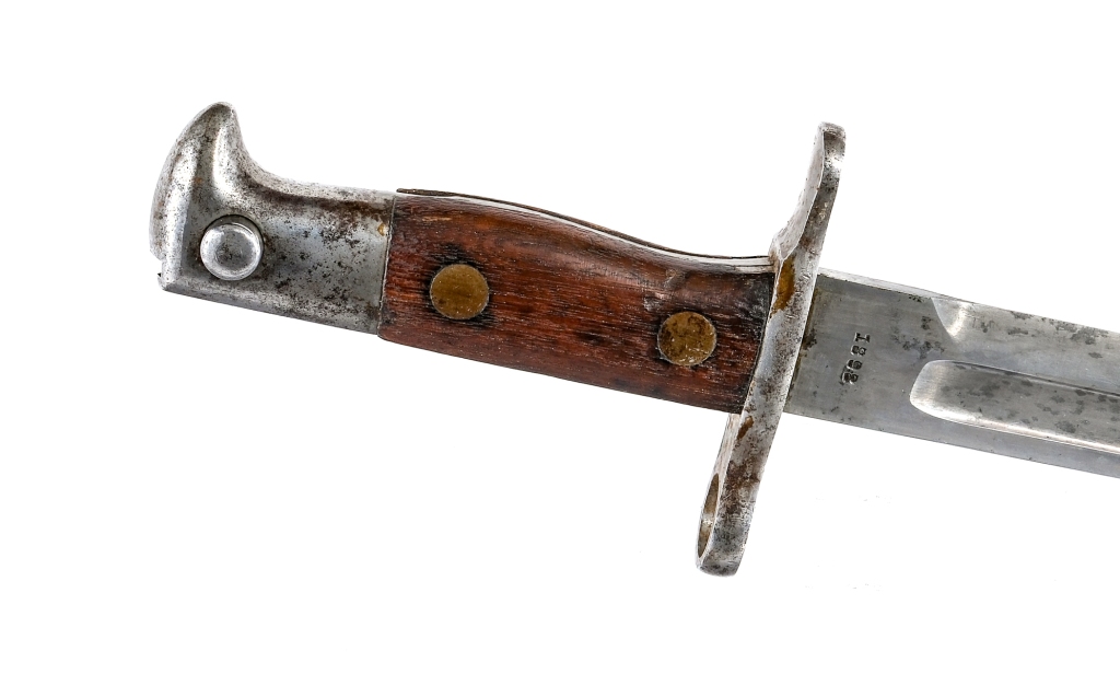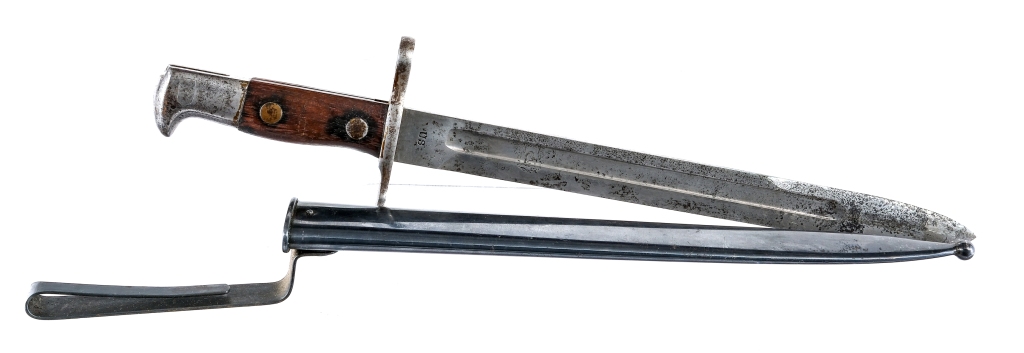 Description U.S. Springfield Armory Model 1898 ( Krag Jorgesen ) in .30-40 Krag with a five round capacity and a 30″ barrel. Blued metal butt plate with cleaning kit door empty. Smooth wood stock and front forend. Blued trigger guard, trigger, receiver and barrel. Rear bolt safety. Rear left side of receiver bolt release. Right side of receiver loading gate. Under barrel fixed bayonet lug. Rear flip up adjustable and front fixed blade sight. Metal loops for mounting a shoulder sling. Left side of stock dated 1899 with inspector proof. Comes with U.S. marked 1898 Krag bayonet and scabbard. Must ship to a C&R or FFL holder. SOLD AS-IS. Condition: Fair with scratches, damage/repair to the wood top cover, rust/finish wear, wood damage to the butt, front barrel band broken, front barrel bulge. The rifled bore has rust and bulge at muzzle area under first barrel band/bayonet lug. Barrel Length: 30″ Serial: 469737 Manufacturer: Springfield Armory Year: 1904 Caliber: .30-40 Krag Model: 1898 Krag Jorgensen Book# 06827