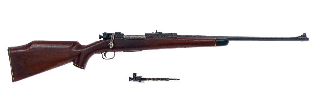 Description U.S. Springfield Model 1903 Sporterized in .30-06 with a five round capacity and a 24″ barrel. Checkered Bishop composite butt plate. Smooth Monte Carlo style wood stock and front forend. Engraved blued trigger guard, magazine floor plate, receiver and barrel. Jeweled bolt body. Rear bolt safety switch. Rear left side of receiver bolt release. Rear adjustable and front fixed blade sight. Comes with extra firing pin assembly and spring. Must ship to a C&R or FFL holder. Condition: Good with scratches, wood dings and spots of rust. The rifled bore has very light rust with strong visible rifling. Barrel Length: 24″ Serial: 880639 Manufacturer: Springfield Armory Caliber: .30-06 Model: 1903 Springfield Book# 03421