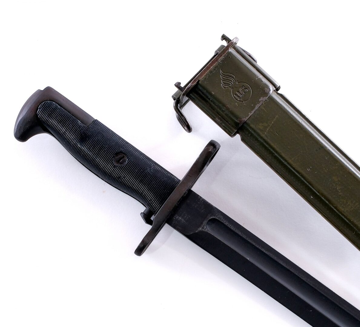 Description U.S. Springfield Armory M1 Garand in (.30M1) which is .30-06 Springfield with a eight round capacity and a 24″ barrel. Arsenal refinished and marked on barrel side: P K SA-A-12-50. Indicating a 1950 refinish. Checkered metal butt plate with cleaning kit door. Chamber brush intact inside butt stock marked: UFH. Smooth wood stock marked: P on the underside of wrist and SA S on the left side of stock. Very faint Springfield Armory crossed cannons proof on the left rear side of stock. Parkerized trigger guard, trigger, receiver and barrel. Right side charging handle. Top of bolt marked: D28287-2SA J9A. Trigger guard marked: C46025 W.R.A. Under barrel fixed bayonet lug. Mounted with a U.S. M1 Bayonet maker marked: PAL. Metal loops for mounting a shoulder sling. Right side of stock aftermarket marked with small impressions from previous owner. Looks like it says CAPTN. Comes with IBM M7 Grenade Launching device, bayonet & scabbard and eleven EN-BLOC clips. Must ship to a C&R or FFL holder. Condition: Very Good with light scratches, wood dings, finish wear and handling wear. Clean rifled bore. Barrel Length: 24″ Serial: 1843105 Manufacturer: Springfield Armory Year: 1950 Caliber: .30-06 Model: M1 Garand Book# 03657