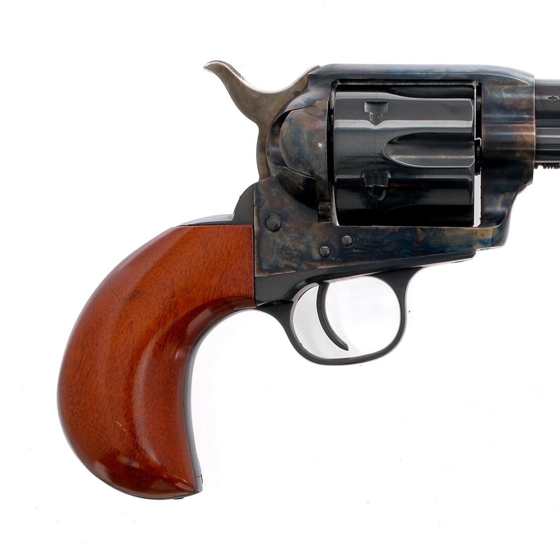 Description Uberti 1873 chambered in .45 Colt with a six-shot cylinder and a 3.5″ barrel. Manufactured in Italy by Uberti and imported by Stoeger, marked on the right side of the barrel. Blued barrel, fluted cylinder, trigger, trigger guard, and grip frame. Case colored frame, loading gate, and hammer. Smooth wood birds head grips. Fixed front blade sight. Must ship to a FFL holder. Condition: Very Good with light scratches, marks, and handling wear. Light cylinder turn line and other operational wear. Light scratches, and dings on the grips. Clean rifled bore. Barrel Length: 3.5″ Serial: UN1324 Manufacturer: UBERTI Caliber: .45 Colt Model: 1873 Book# 02903