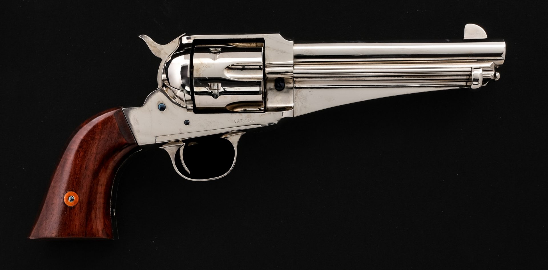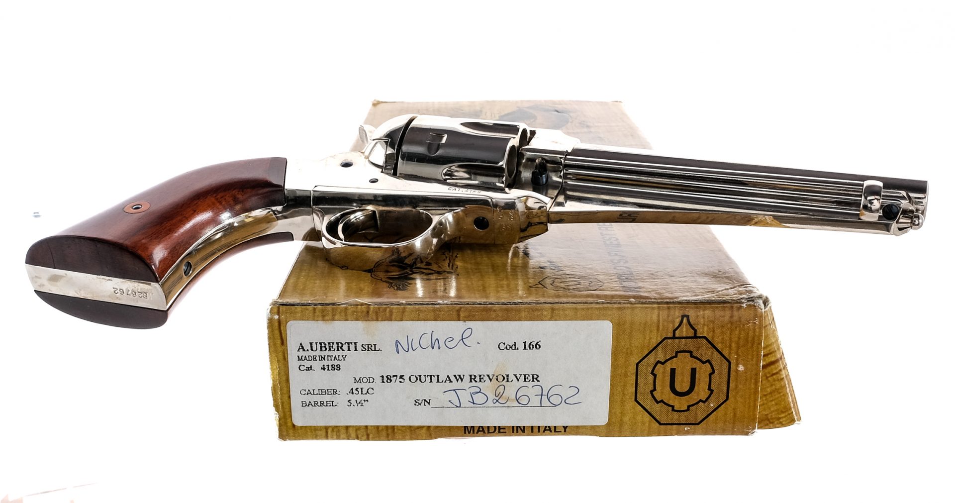 Description Upgraded and Deluxe Exhibition Uberti Model 1875 Army Outlaw in .45 Long Colt with a six round capacity and a 5.5″ barrel. Replica of a 1875 Remington. Smooth wood grip plates. Nickel finished frame, trigger guard, trigger, checkered hammer, cylinder and barrel. Fire blued screws. Right side of frame loading gate. Under barrel ramrod. Front fixed blade sight. Comes in its factory box with written matching serial number and instruction manual. Must ship to a FFL holder. Condition: Like New with light handling wear. Clean rifled bore. From the personal collection of Maria Uberti, daughter of founder Aldo Uberti. This collection is comprised of exhibition guns, salesman’s samples, prototypes, and experimental designs. Many of the guns in the Uberti family collection were screen used in movies and television from the 1950’s through the early 2000’s. Accompanied by a hand-signed letter of authenticity from Lisa Keller, Former Manager of Uberti USA, Lakeville CT. Barrel Length: 5.5″ Serial: JB26762 Manufacturer: Uberti Year: 2002 Caliber: .45 LC Model: 1875 Army Outlaw Book# 00540