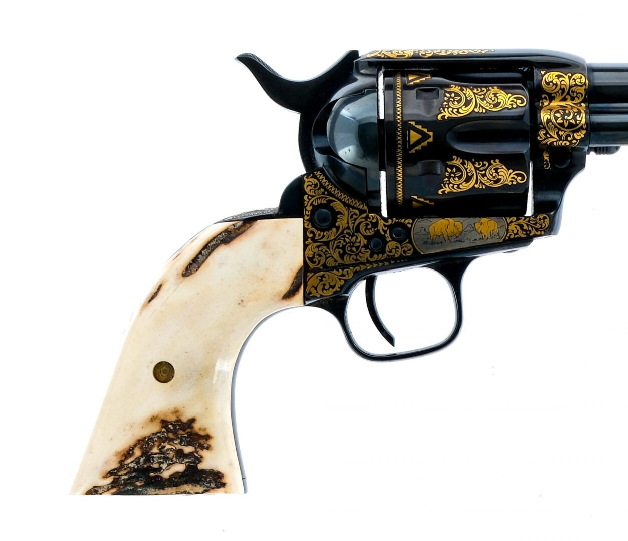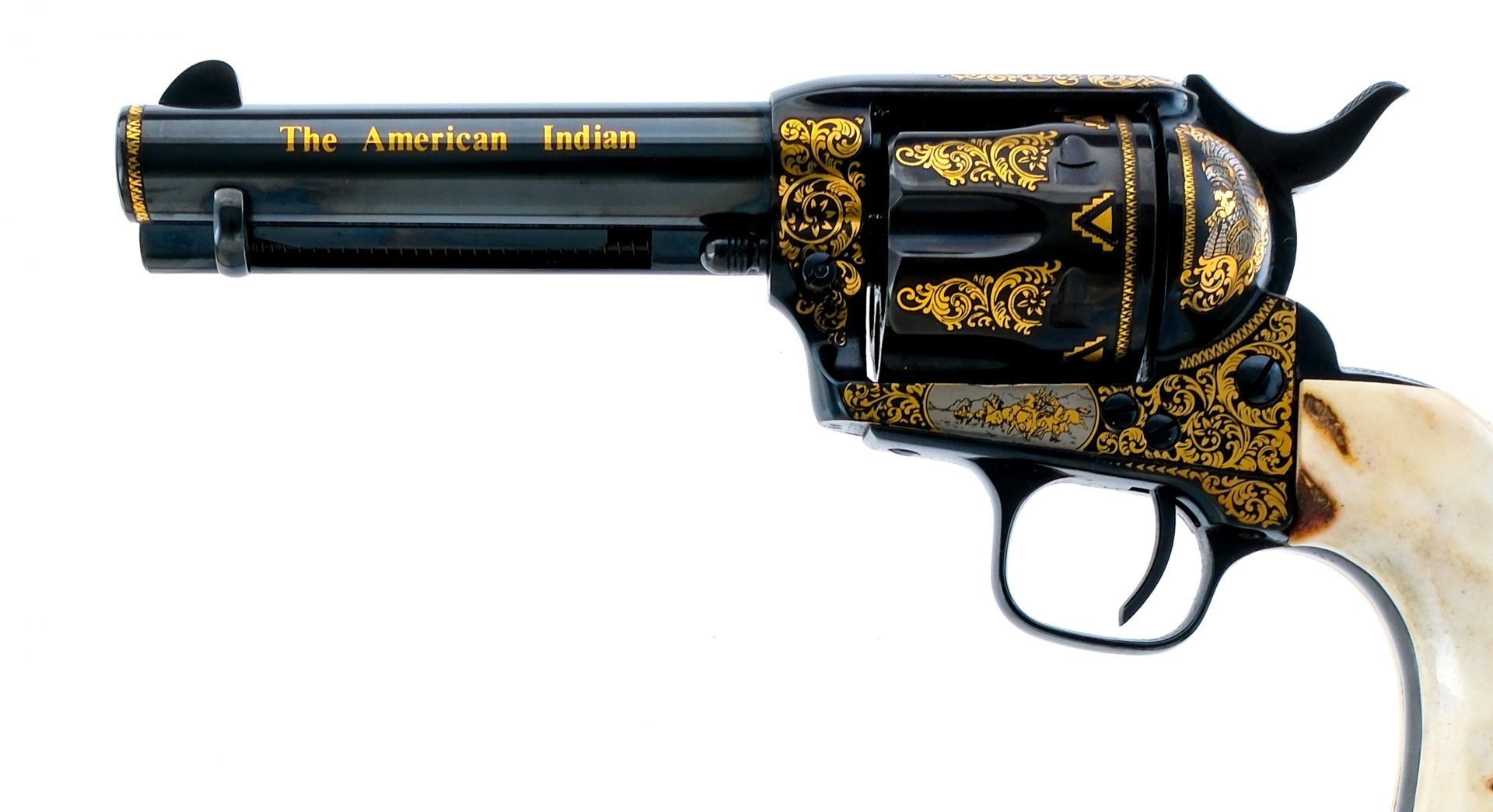 Description Uberti Single Action Army The American Indian Tribute chambered in .45 Colt with a six-shot cylinder and a 4 3/4″ barrel. Blued barrel, frame, fluted cylinder, single action trigger, and hammer. Hand fitted genuine stag grips. Rear notch and front blade iron sights. This is number 65 of only 300 made with “065 of Three Hundred” engraved in 24-karat gold on the right side of the barrel and “The American Indian” on the left side. 24-Karat gold scroll engraving on he frame and cylinder. Buffalo images engraved on both sides of the frame with nickel backgrounds. The recoil shield is engraved with a Native Chief wearing a traditional buffalo skull cap. The backstrap is also engraved with 24-karat gold and nickel showing a diamond bulls head war shield. Comes in a green velvet lined display case with America Remembers plaque. Must ship to a FFL holder. Condition: Very good, appears to have been unused with very light handling to no handling wear. Some scattered spots of metal oxidation from poor storage. Bright and clean bore with strong rifling. Barrel Length: 4 3/4″ Serial: SA125637 Manufacturer: UBERTI Caliber: .45 Colt Model: SAA The American Indian Book# 04701