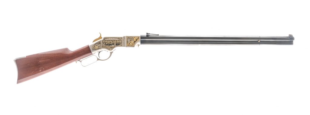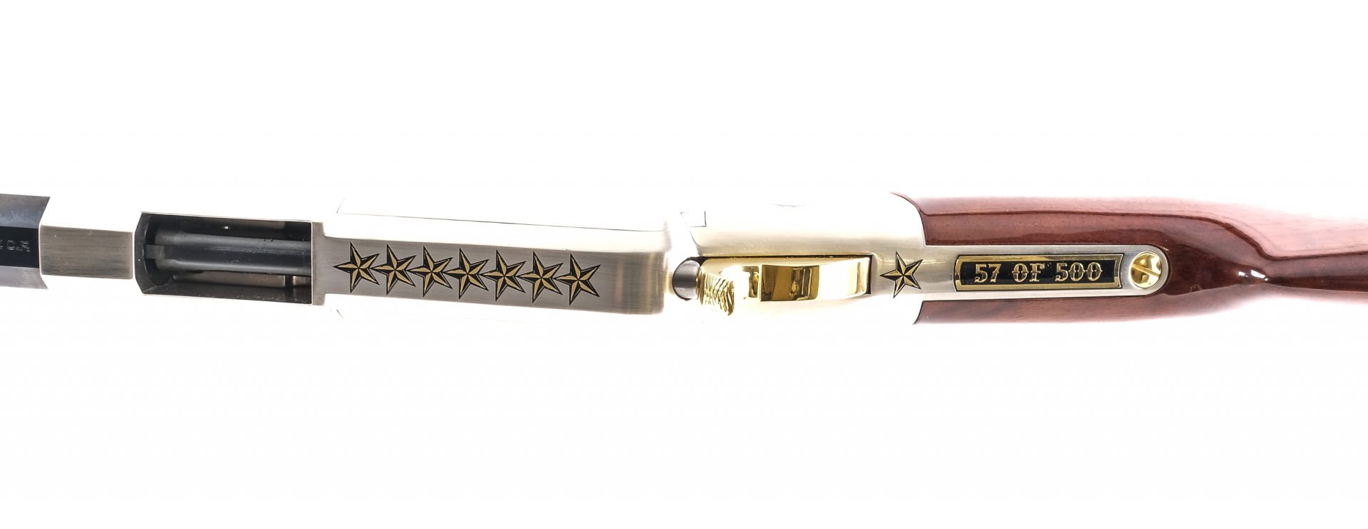 Description Uberti Henry Rifle General Lee Commemorative with a thirteen round internal magazine and a 24 1/4″ octagonal barrel. Manufactured by Uberti and imported by Taylors & CO. Winchester VA. Engraved by A & A Engraving inc. Blued barrel and full length magazine tube. Polished steel frame, lever, and butt plate. Gold plated textured hammer. Smooth wood stock with glossy finish. Receiver is engraved with General Robert E. Lee and his generals. “57 OF 500″ is engraved on the tang. Comes in a black Plano case. Must ship to FFL holder. Condition: Very good/Excellent with light handling and storage wear. Clean rifled bore. Barrel Length: 24 1/4” Serial: W25437 Manufacturer: UBERTI Caliber: .44-40 Winchester Model: Henry Rifle Lee and his generals Book# 10-724