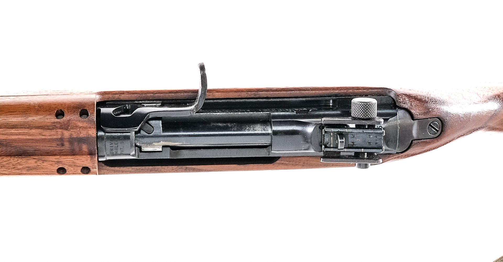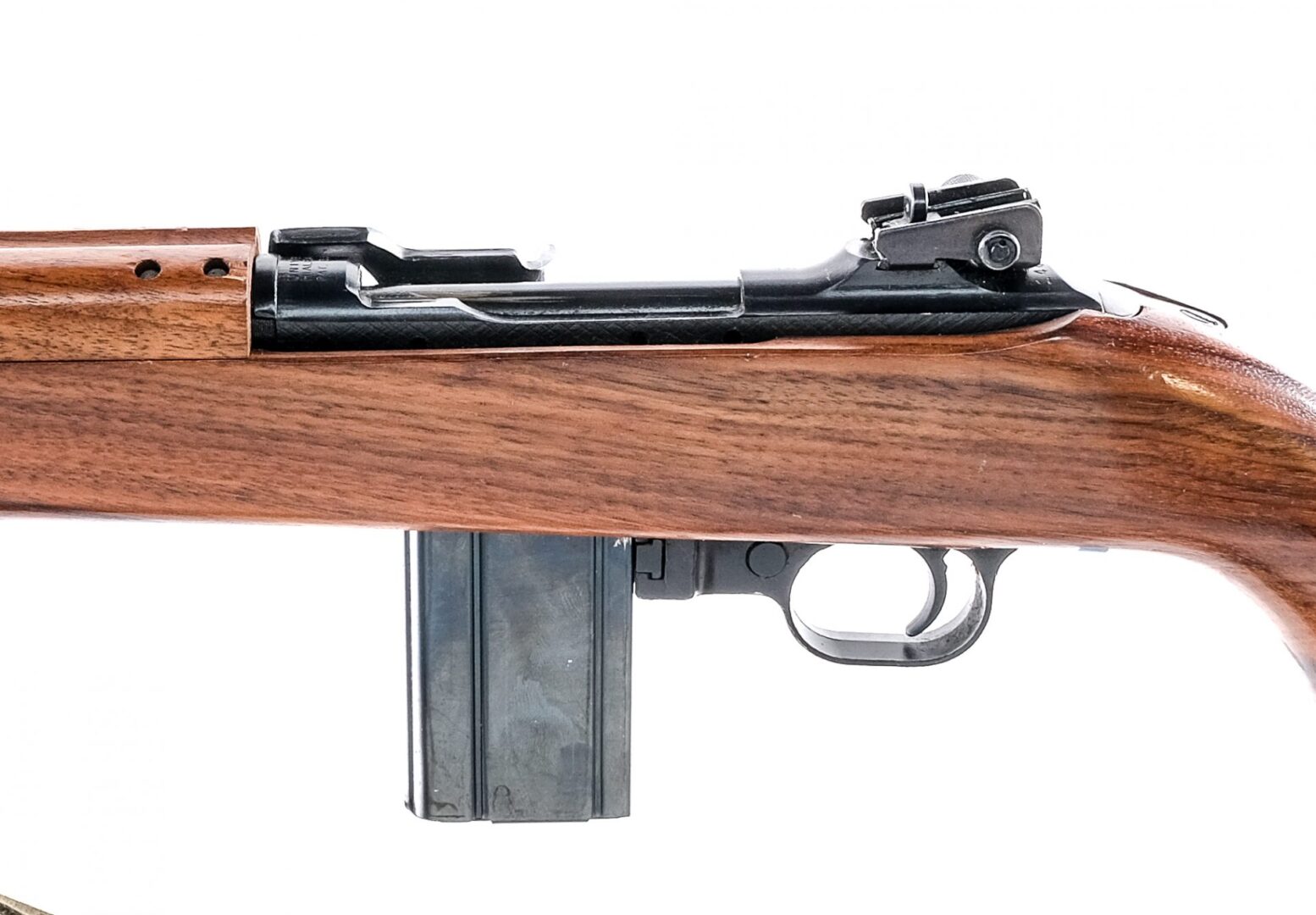 Description Universal M1 Carbine in .30 carbine with one, fifteen round removable magazines and a 18″ barrel. Four factory drilled and tapped holes for scope mount on left side of receiver. Checkered metal butt pad. Smooth wood stock and front forend. Blued receiver, untextured trigger, charging handle and barrel. Alloy trigger guard, black finish. Front trigger guard safety switch and magazine release. Rear adjustable and front fixed blade sight. Comes with cloth sling with oil bottle. Must ship to a C&R or FFL holder. Condition: GOOD/VERY GOOD, with some finish wear on both wood/steel from handling and operational use. Rust blotches on butt plate, some rust on right side of front barrel band. Bore has sparse spots of pitting with strong rifling. Barrel Length: 18 Serial: 144255 Manufacturer: Universal Caliber: .30 Carbine Model: M1 carbine Year-Range 1969 and 1972 Book# 01872