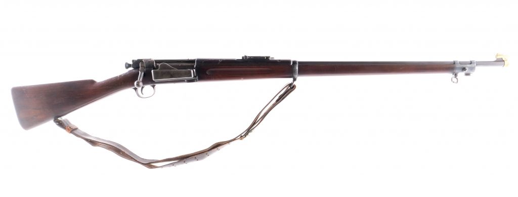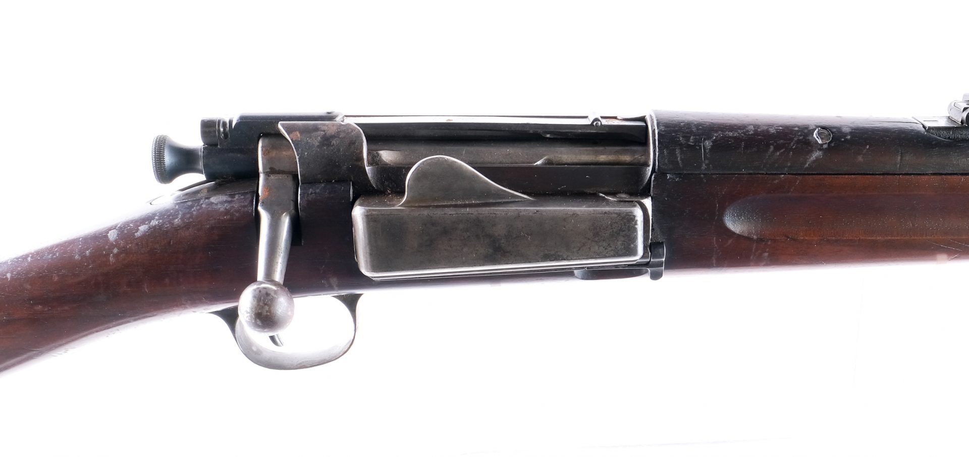 Description U.S. Springfield Krag Jorgensen in .30-40 Krag with a five round capacity and a 30″ barrel. Metal butt plate with cleaning rod door with rod and oiler tube intact inside. Smooth wood stock and front forend. Blued trigger guard, untextured trigger, bolt, receiver and barrel. Rear bolt safety switch. Left side of receiver located bolt release switch. Right side of receiver loading gate door. Under barrel fixed bayonet lug. Rear flip up adjustable and front fixed blade sight. Comes mounted with a leather shoulder sling and brass muzzle cover. Must ship to a C&R or FFL holder. Condition: Good/Very Good with light touches of rust and handling wear. LCP is engraved into both side of butt stock. The rifled bore has very light rust with strong visible rifling. Barrel Length: 30″ Serial: 258183 Manufacturer: Springfield Armory Year: 1900 Caliber: .30-40 Krag Model: 1898 Krag Jorgensen Book# 10-434