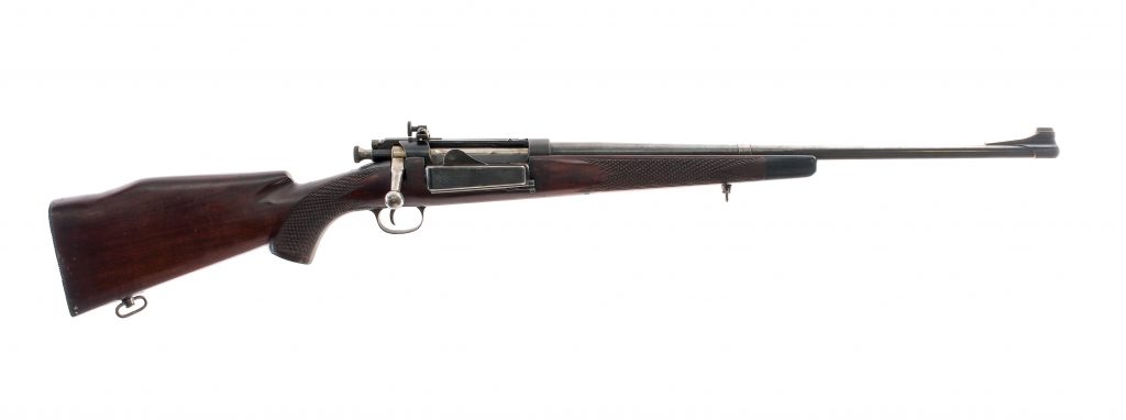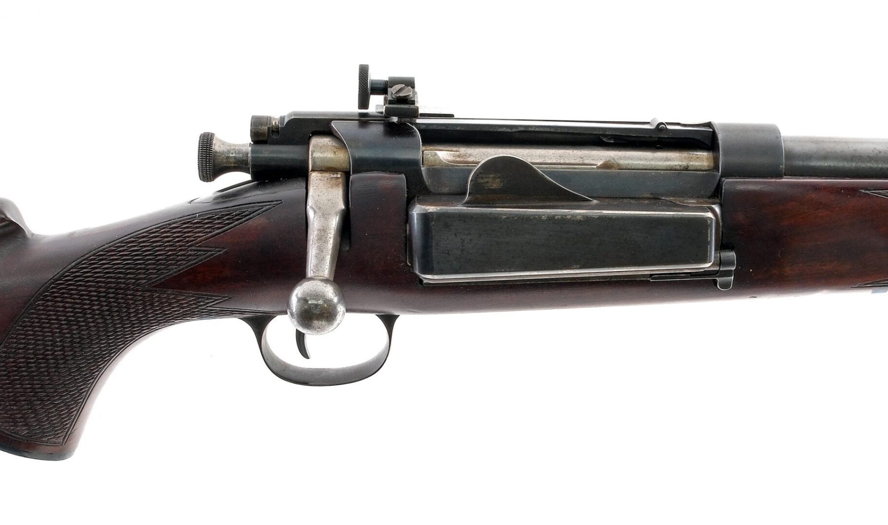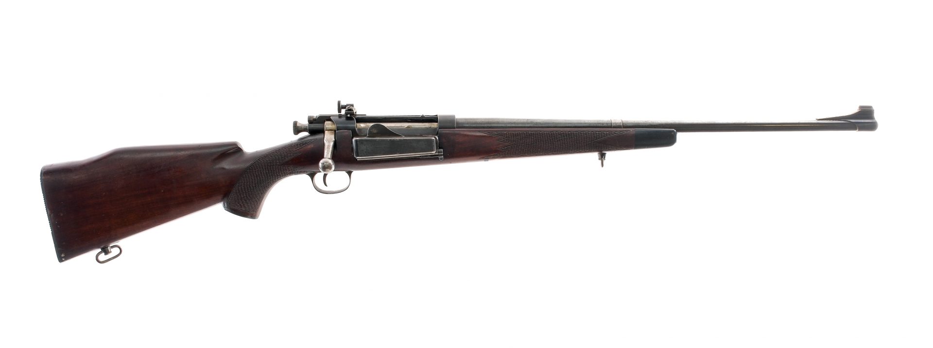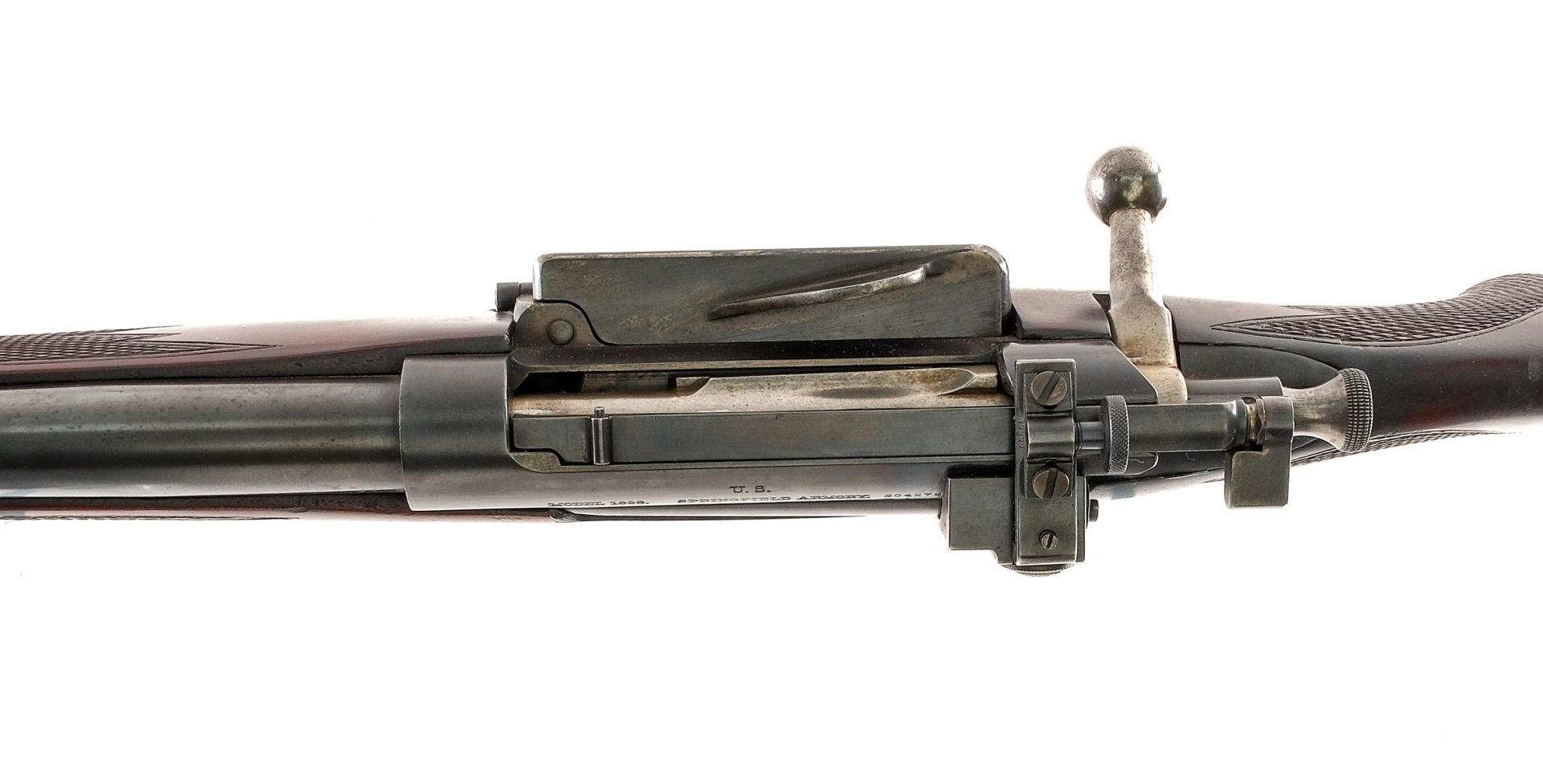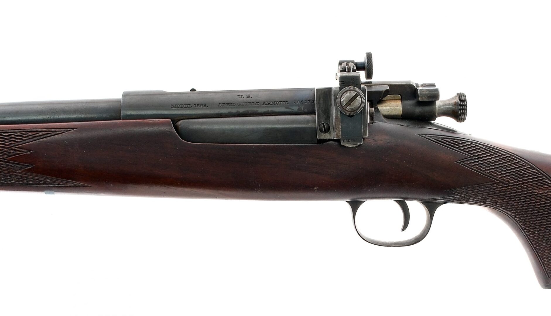 Description U.S. Springfield Armory 1898 Krag chambered in .30-40 Krag with a five round integral magazine and a 23″ barrel. The receiver was manufactured in 1900 withs serial number 204272. Blued barrel, receiver, magazine, trigger, and trigger guard. Unfinished bolt with flag style safety. Aftermarket wood Monte Carlo stock with diamond checkered forend and pistol grip. Ribbed Bishop Stocks butt plate. Front and rear sling swivels. The receiver is drilled and tapped and mounted with an aftermarket adjustable peep sight. Aftermarket ramped front blade sight with custom engraved/stippled ramp. Must ship to a FFL or C&R holder. Condition: Good/Very Good as being Sporterized, light scratches and finish wear from handling and operation. Spots of finish patina. Light speckling of metal oxidation across most metal parts. Some scratches, scuffs, and dings in the wood. Mostly clean bore with light frosting of metal oxidation, strong visible rifling. Barrel Length: 23″ Serial: 204272 Manufacturer: SPRINGFIELD ARMORY Year: 1900 Caliber: .30-40 Krag Model: 1898 Krag Book# 02469