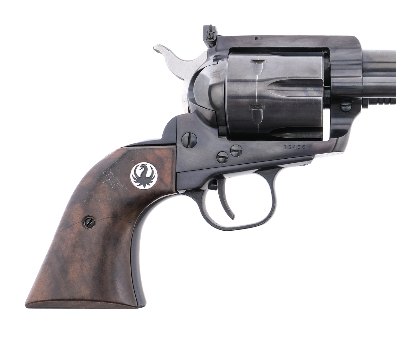 Description Ruger Blackhawk chambered in .44 magnum with a six-shot cylinder and a 6.5″ barrel. Blued barrel, frame, cylinder, trigger, and trigger guard. Stainless ribbed hammer. Smooth wood Ruger grips. Right side loading gate. Under barrel cylinder release pin. Rear adjustable and front fixed blade sight. Comes in a mismatched Ruger box. Must ship to a FFL or C&R holder. Condition: Good/Very good with light handling wear, and some small spots of finish loss near the muzzle and on a few sharp edges. Small crack on the right grip. Very clean bore with strong rifling. Barrel Length: 6.5″ Serial: 13466 Manufacturer: RUGER Caliber: .44 Magnum Model: Blackhawk Year-Range 1958-1959 Book# 10-544