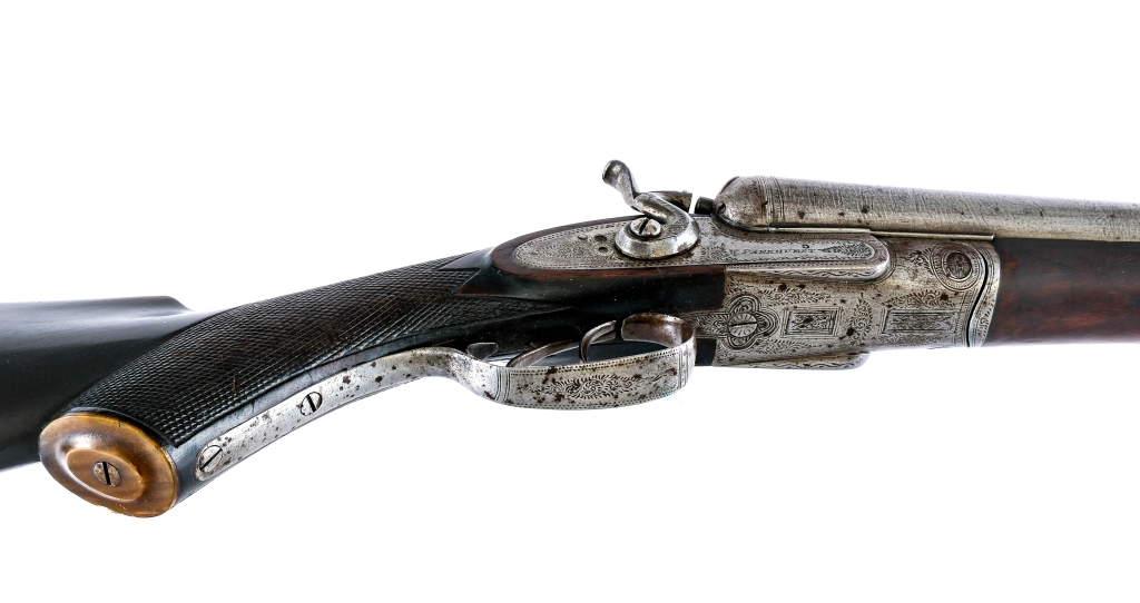 Description Belgian made W. Parkerhurst Side by Side Shotgun chambered in 12 gauge for 2 3/4″ shells with a 27 3/4″ London Laminated steel barrels. Double hammers and double triggers . Engraving on the barrel, lock, hammers, lever, and trigger guard. Checkered wood forend and pistol grip stock with black butt plate. The butt plate shows deer scenes. Brass bead front sight. Must ship to a FFL or C&R holder. Condition: Fair with most of the finish being in the white with spots of patina and metal oxidation. Scratches, scuffs, sharp edge wear, and ding son the wood. Thins crack on the forend. The smooth bores are bright with spots of metal oxidation/pitting. SOLD AS-IS. Barrel Length: 27 3/4″ Serial: 4256 Manufacturer: W. Parkerhurst Gauge: 12 Ga. Model: Side by Side Hammered