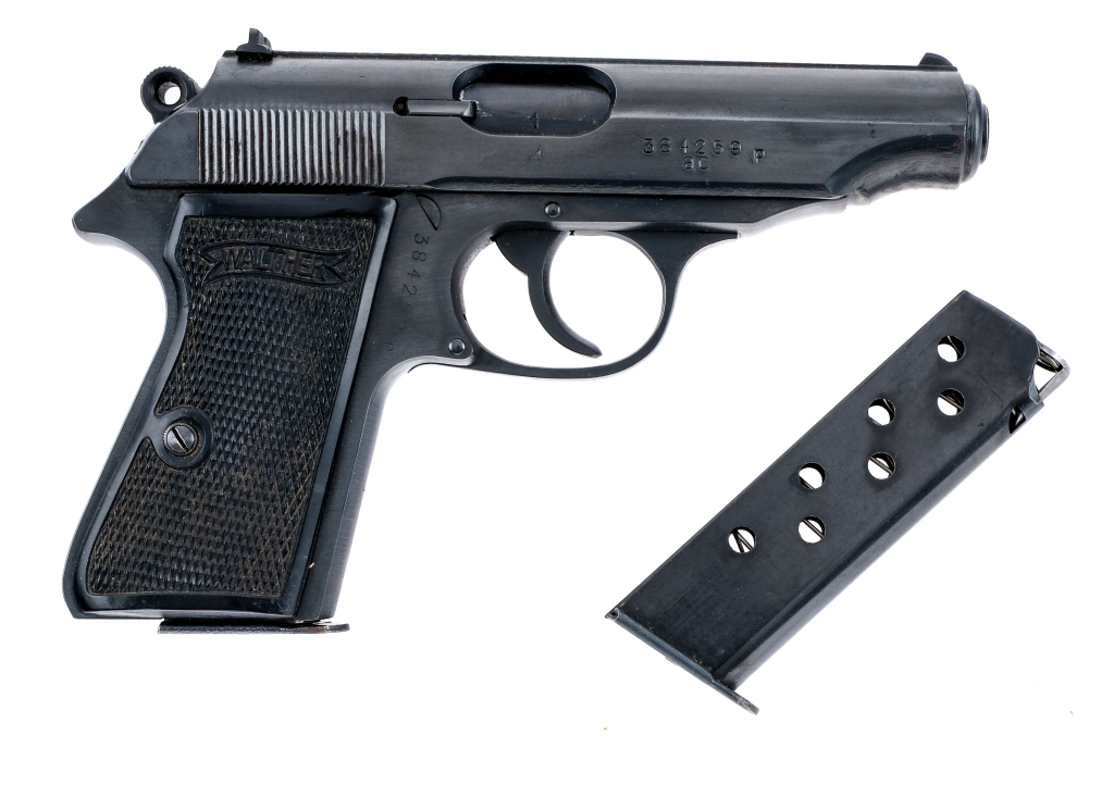 Description German Walther ac PP chambered in .32 ACP with two, eight round magazines and a 4″ barrel. Manufactured in 1945 with serial number 384259P. Blued steel frame with checkered polymer Walther grips and push button magazine release. Double/single action trigger and hammer. Blued serrated slide with mounted de-cocker/safety lever. Serial number matching frame and slide. Eagle over N proof on the right side of the slide and barrel. Must ship to a FFL or C&R holder. Condition: Fair/Good having been refinished with visible buffing marks, metal oxidation, and wear under the finish. Scratches and handling wear. Some spots of finish thinning and metal oxidation. Light wear on the grips. The bore is bright with a few heavy patches of metal oxidation, strong visible rifling. Barrel Length: 4″ Serial: 384259P Manufacturer: WALTHER Year: 1945 Caliber: .32 ACP Model: PP Book# 07884