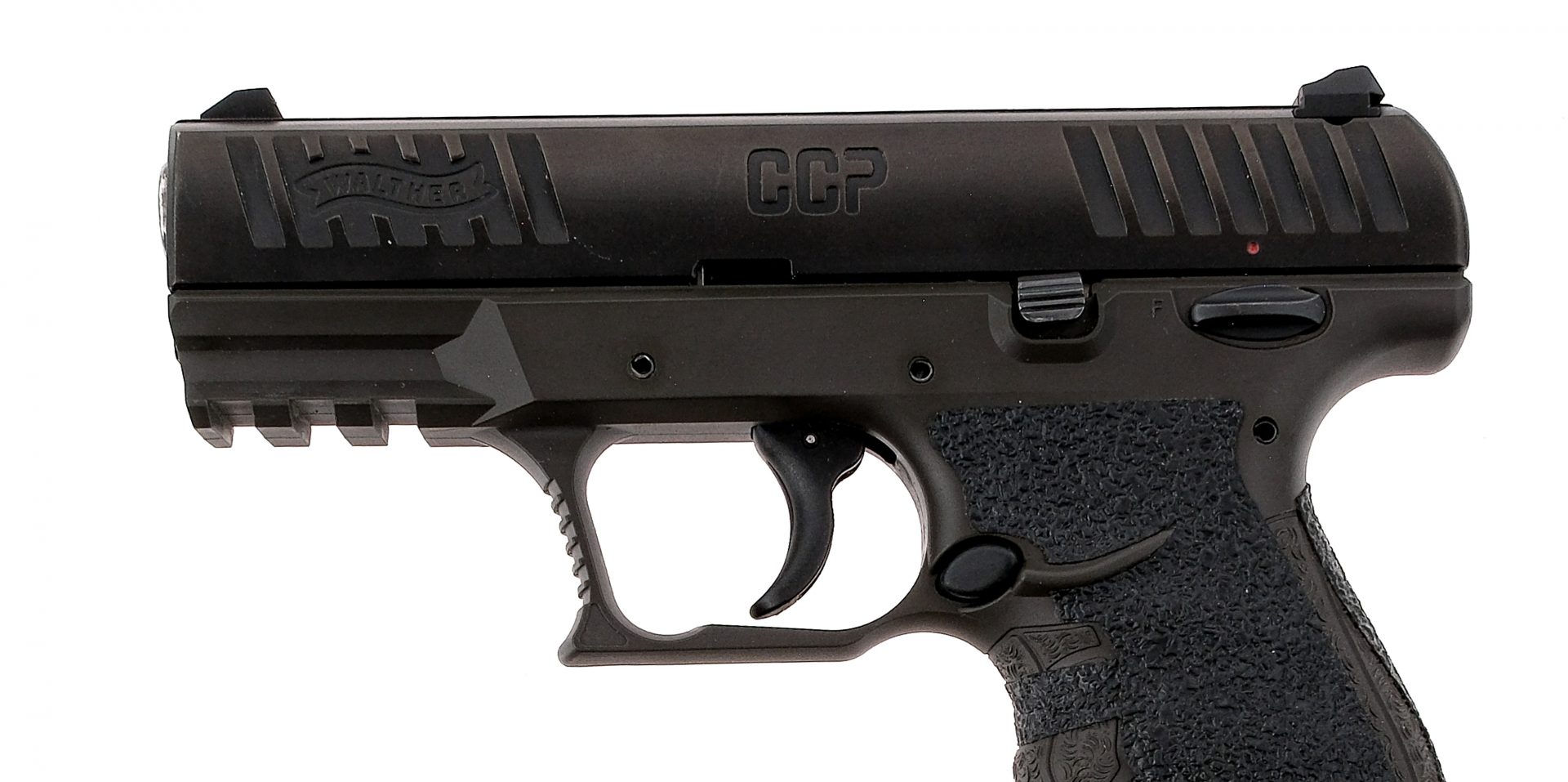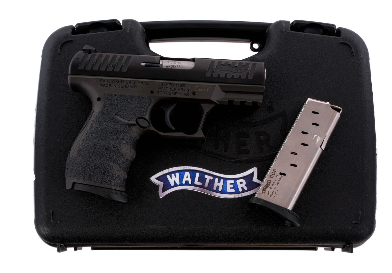 Description Walther CCP chambered in 9mm with two, eight round removable magazines and a 3.54″ barrel. Manufactured in Germany by Walther and imported by Walther Arms, marked on the right side of the frame. Textured polymer frame with after market grip tape and under barrel accessories rail. Polymer trigger and frame mounted manual safety. Black finished slide with front and rear slide serrations and three-dot iron sights. Comes in its factory box with spare front sights, tools, and two magazines. Must ship to a FFL holder. Condition: Very good/Excellent with very light handling wear. Clean rifled bore. Barrel Length: 3.54″ Serial: WK064750 Manufacturer: WALTHER Caliber: 9x19mm Parabellum Model: CCP Book# 04592