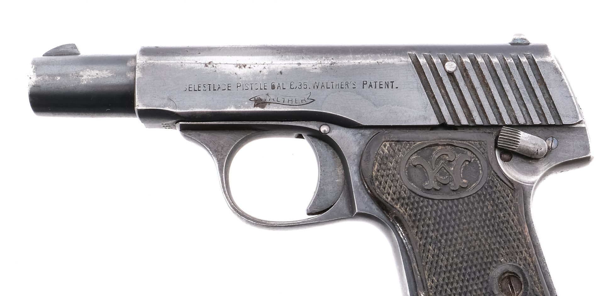 Description Carl Walther Model 7 First Variant in 6.35mm which is .25 caliber with one, seven round removable magazine and a 3.25″ barrel. Checkered composite grip plates. Blued frame, solid trigger, serrated slide and barrel. Magwell located serrated magazine release. Rear left side of frame serrated safety switch. Front and rear fixed sights. Must ship to a C&R or FFL holder. Condition: Good with light finish wear/loss and rust. Clean rifled bore. Barrel Length: 3.25″ Serial: 32999 Manufacturer: Walther Caliber: .25 ACP Model: 7 Book# 10-703