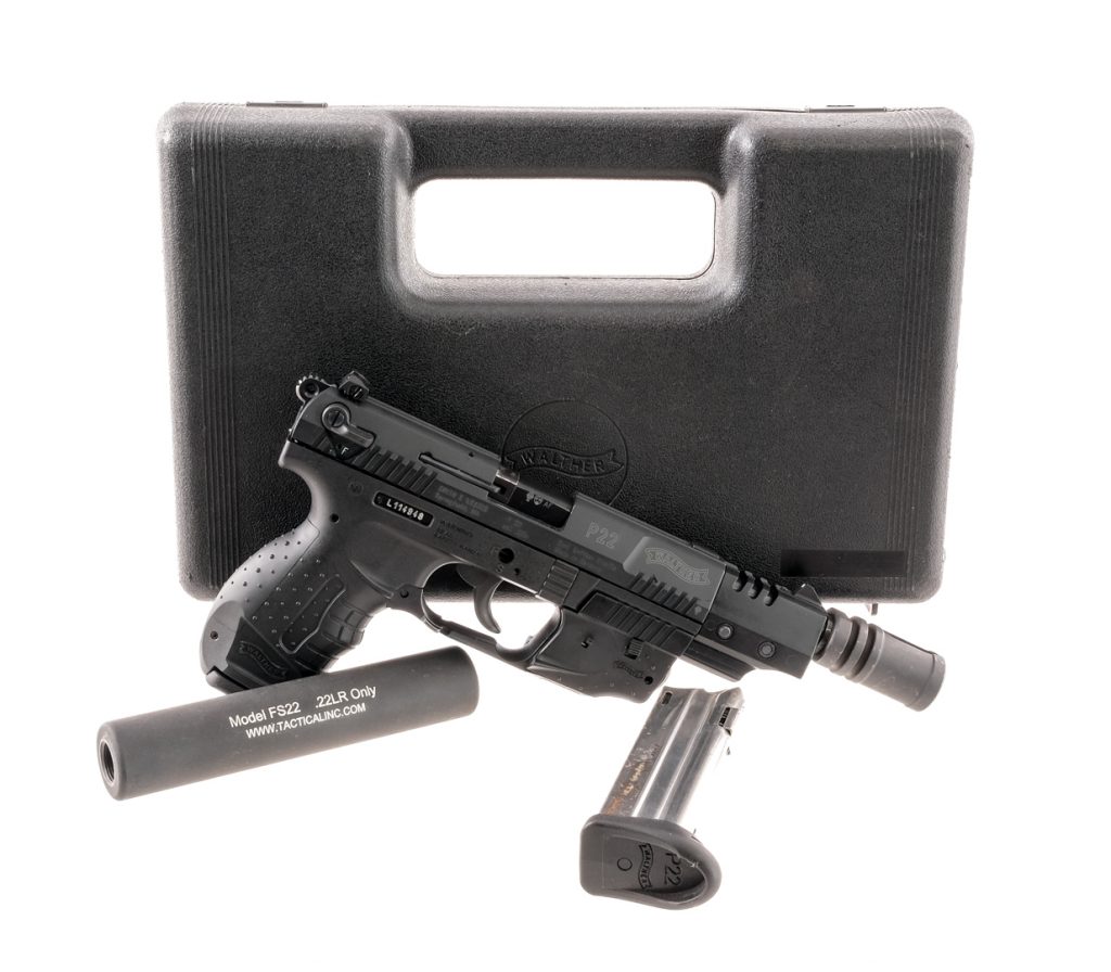 Description Walther Model P-22 in .22 Long Rifle with two, ten round removable magazine and a 5.5″ barrel. Made in Germany and imported by Smith & Wesson of Massachusetts. The barrel has a compensator and is threaded. Comes with a Faux suppressor and A2 birdcage flash hider. Dimpled grip on black composite frame. Walther laser sight mounted on frame. Blued serrated metal slide and hammer. Smooth composite trigger. Ambidextrous magazine release on the trigger guard. Rear slide located ambidextrous safety switch. Left side of frame serrated slide release. Mid-frame serrated ambidextrous take-down switch. Rear adjustable and front fixed blade sight. Above trigger on right side of frame, trigger lock mechanism. Comes in its factory hard case. Must ship to FFL holder, check local and state laws on threaded barrels. Condition: Very good/Excellent with light handling wear and a clean riffled bore. Barrel Length: 5.5″ Serial: L113938 Manufacturer: WALTHER Caliber: .22 Long Rifle Model: P22
