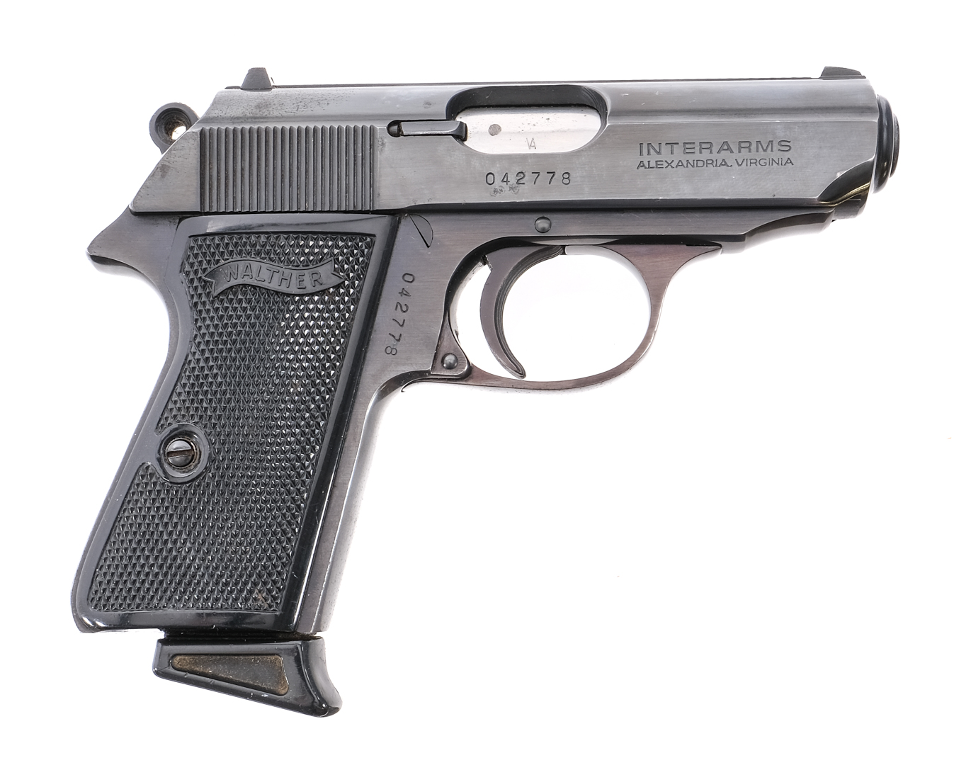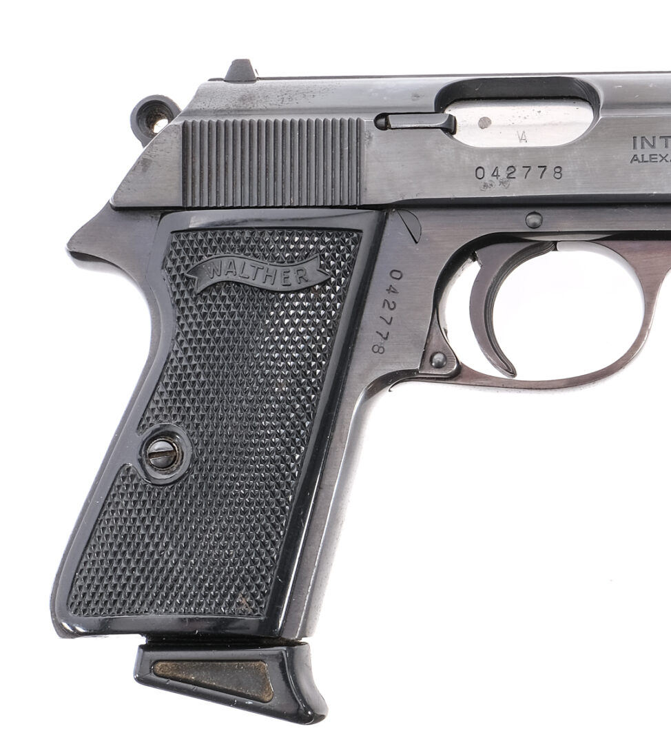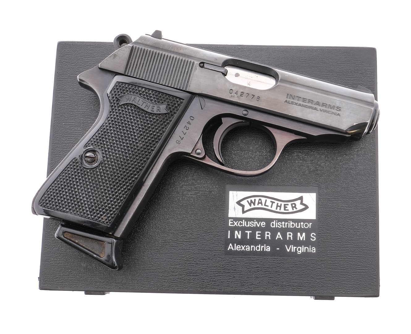 Description Walther PPK/S chambered in .380 caliber with one, seven round removable magazine and a 3.5″ barrel. Manufactured by Walther and imported by Interarms. Blued barrel, slide, frame, serrated trigger, and hammer. Black diamond checkered composite grips. Push button magazine release. Double/single action with slide mounted de-cocker/safety selector. Fixed iron sights. Comes in its factory box with matching serial number, manual, and test fire target. Must ship to FFL holder. Condition: Good/Very good with general handling and use wear. Some small spots of finish loss on the top of the slide and near sharp edges. Some speckling of metal oxidation on the slide and barrel. Bore is clean with good rifling. Barrel Length: 3.5″ Serial: 042778 Manufacturer: WALTHER Caliber: .380 ACP Model: PPK/S Year-Range 1983-1984 Book# 10-496