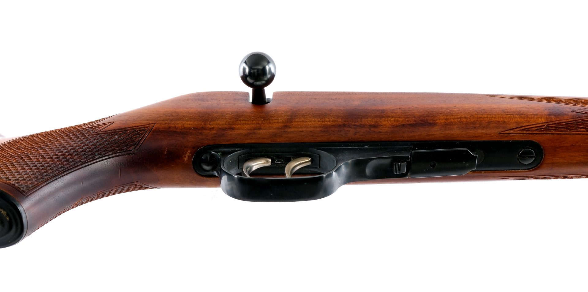 Description Walther Sportwaffenfabrik in .22 Long Rifle with one, five round removable magazine and a 22″ barrel. Made in Germany and import marked on the top of receiver by Interarms Alexandria. Serrated composite butt plate. Checkered Monte Carlo style stock and front forend. Blued trigger guard, receiver, bolt handle and barrel. Unfinished double set trigger. Rear bolt safety switch. Rear left side of receiver serrated bolt release. Rear adjustable and front hooded fixed blade sight. Metal loops to mount a shoulder sling. Must ship to a C&R or FFL holder. Condition: Very Good with light scratches, dings and handling wear. Clean rifled bore. Barrel Length: 22″ Serial: 4349 Manufacturer: Walther Year: 1973 Caliber: .22 LR Model: Sport Model Book# 05633