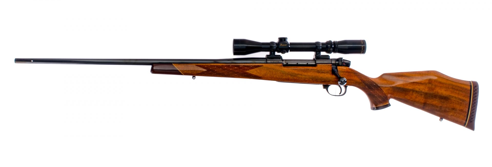 Description Weatherby Mark V in .300 Weatherby Magnum with a four round capacity and a 26″ ported barrel. Made in Japan. Left handed rifle. Rubber butt pad. Checkered Monte Carlo style wood stock and front forend. Blued trigger guard, serrated trigger, receiver, bolt handle and barrel. Left rear side of receiver located safety switch. No fixed sights. Comes mounted with a Burris 3x-9x Fullfield scope with clear glass and a duplex reticle. Comes with a Torel marked leather shoulder sling. Must ship to a FFL holder. Condition: Good/Very Good with light scratches and spots of rust at the muzzle and magazine floor plate. Clean rifled bore. Barrel Length: 26″ Serial: H187252 Manufacturer: Weatherby Caliber: .300 WM Model: Mark V Year-Range 1984-1986 Book# 03347