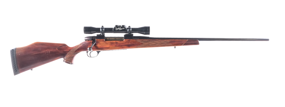 Description Weatherby MKV in .270 Winchester with a four round capacity and a 24″ barrel. Made in Germany. Textured rubber butt pad. Checkered Monte Carlo style wood stock and front forend. Blued trigger guard, serrated trigger, receiver, bolt handle and barrel. Rear right side of receiver serrated safety switch. No fixed sights. Comes mounted with a Weatherby Imperial 4×81. Sling swivels with a Boyt leather and brass shoulder sling. Must ship to a C&R or FFL holder. Condition: Very Good with finish wear on the wood, scratches and handling wear. Clean rifled bore. Barrel Length: 24″ Serial: 26290 Manufacturer: Weatherby Caliber: .270 Win Model: MK V Year-Range 1959-1973 Book# 10-650