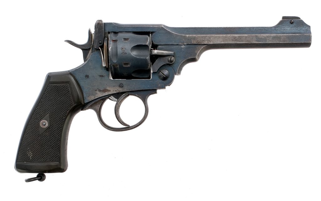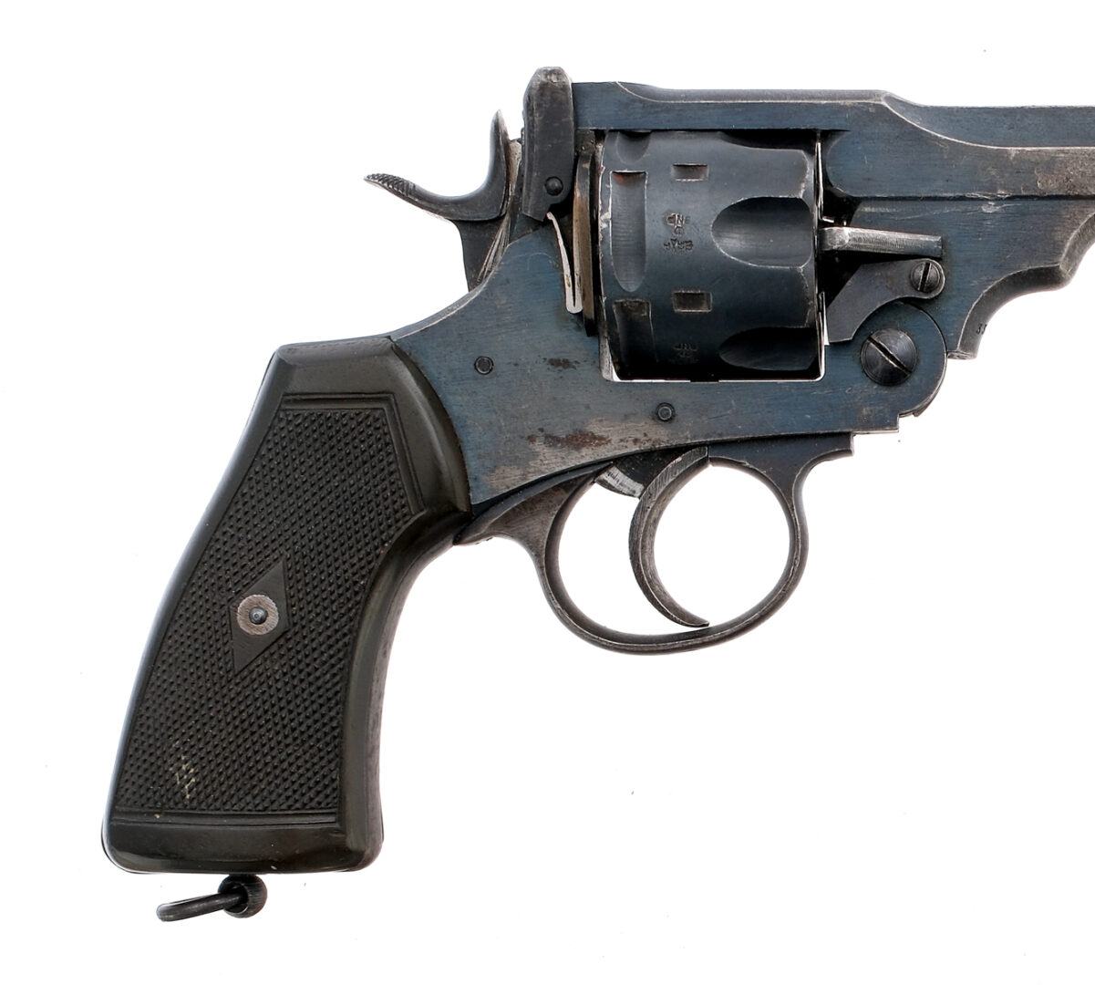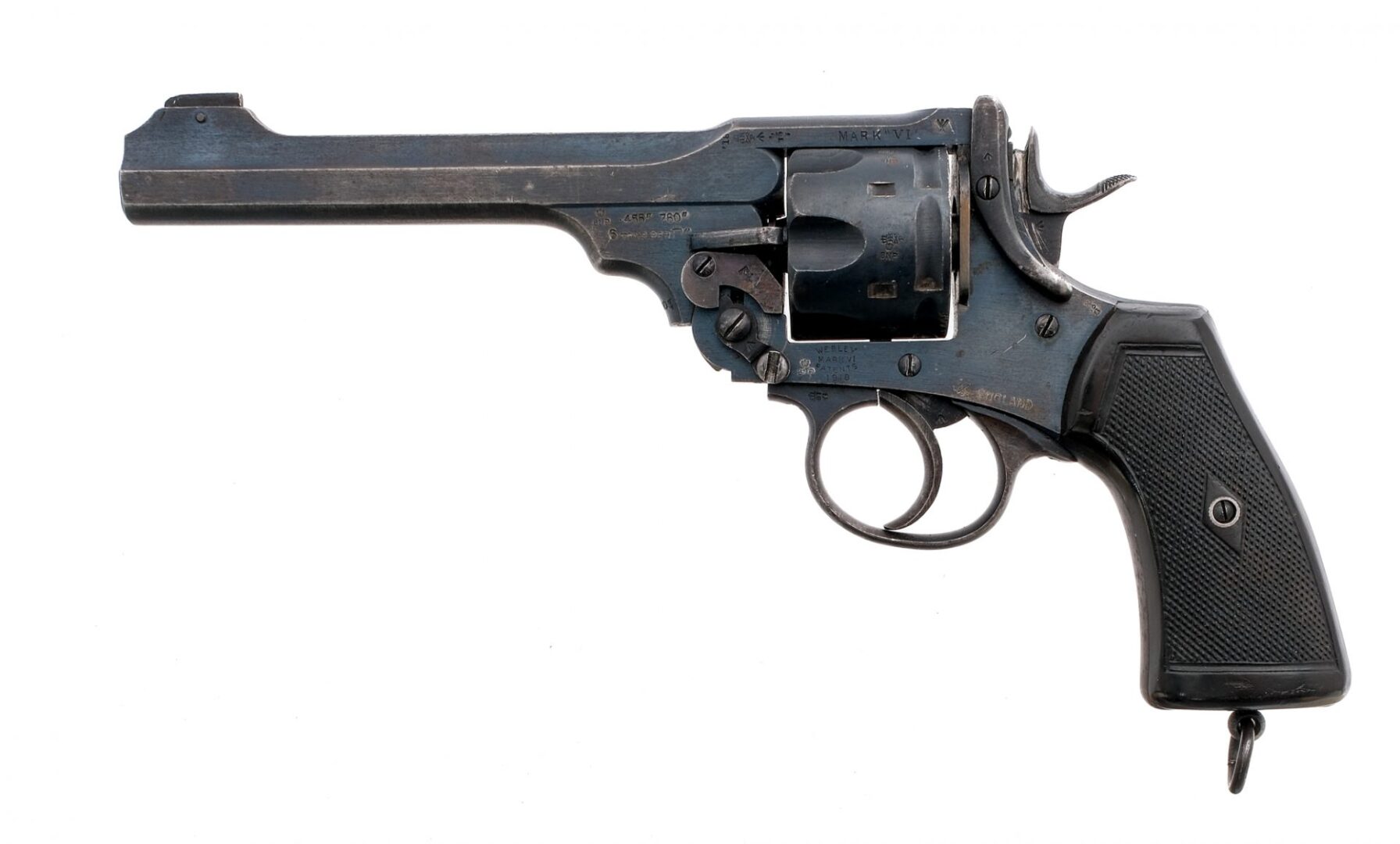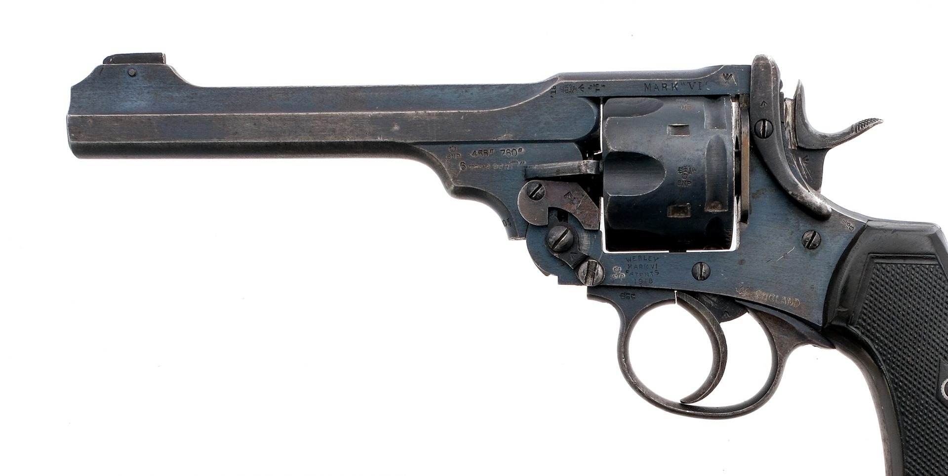 Description Webley Mark VI in .45 caliber with a six round capacity and a 6″ barrel. Checkered composite grip plates. Blued trigger guard, trigger, cylinder, checkered hammer, frame and barrel. Left side of frame checkered top break lever. Bottom side of of pistol grip located lanyard loop. Front and rear fixed sights. Cylinder shaved down to accept a .45 ACP round. Matching serial number on frame and barrel. Cylinder has mismatched serial number to revolver. Revolver left side of frame marked with English export and military acceptance proofs. Must ship to a C&R or FFL holder. Condition: Good with scratches, finish wear/loss, spots of rust and a crack in the left side grip plate. Clean rifled bore. Barrel Length: 6″ Serial: 355903 Manufacturer: Webley & Scott Caliber: .45 ACP Model: Mark IV Book# 01234