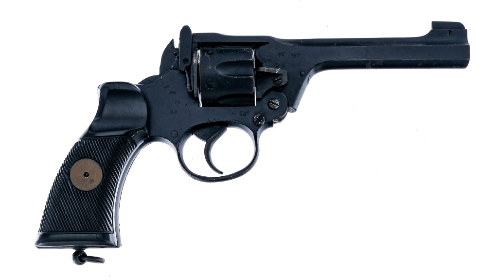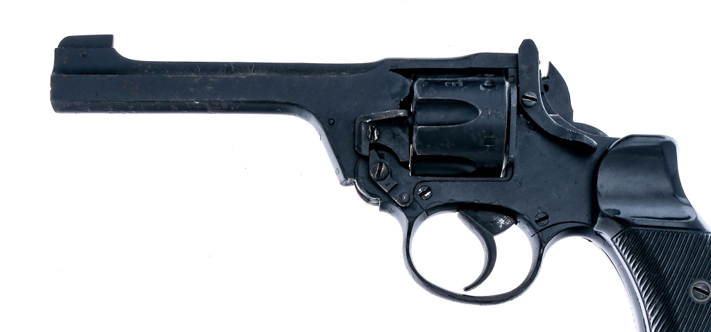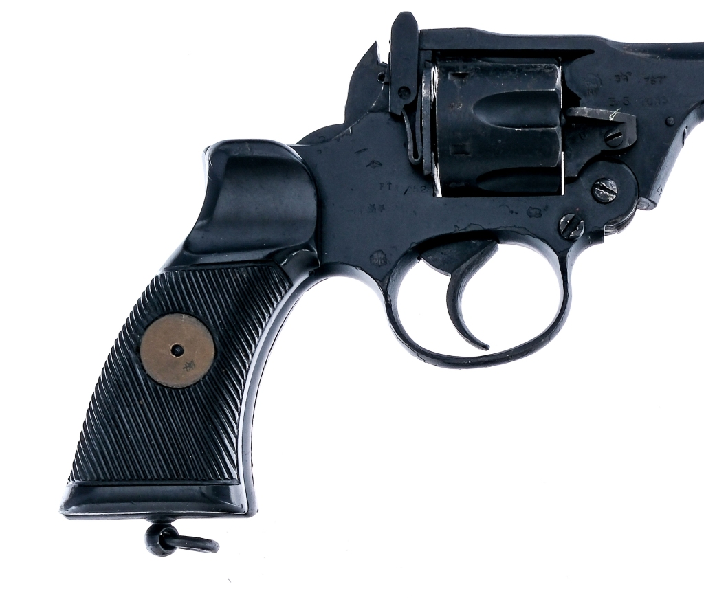 Description Webley No. 2 MK I in .38 Smith & Wesson with a six round capacity and a 5″ barrel. Serrated composite grip plates. Black finished trigger guard, trigger, frame, cylinder, hammer and barrel. Bottom of pistol grip lanyard loop. Left side of frame knurled top break lever. Rear notch and front fixed blade sight. Must ship to a FFL holder. Condition: Good as being refinished with scratches, dings and handling wear. Clean rifled bore. Barrel Length: 5″ Serial: 77940 Manufacturer: England Webley Caliber: .38 S&W Model: No 2 MK I Book# 08152