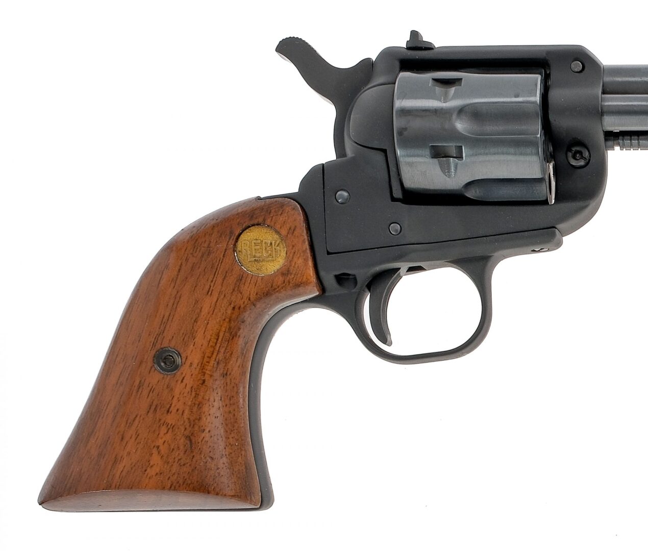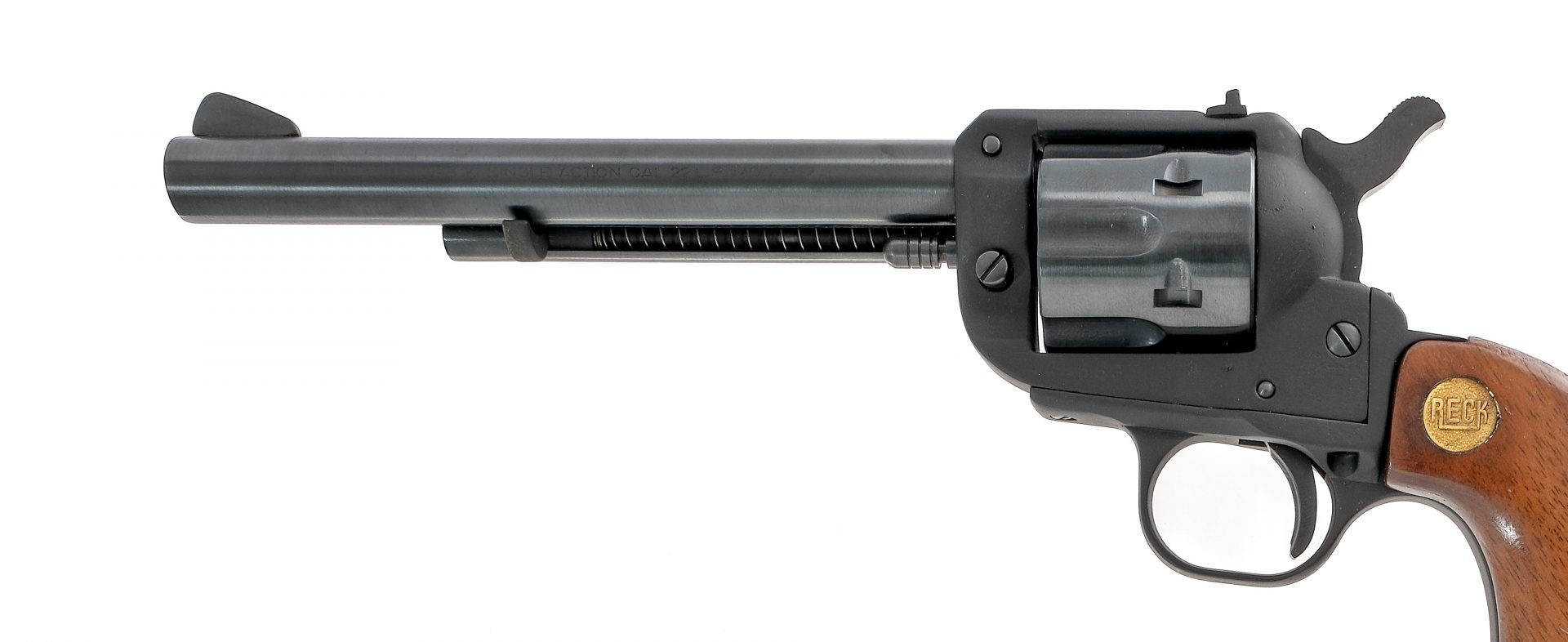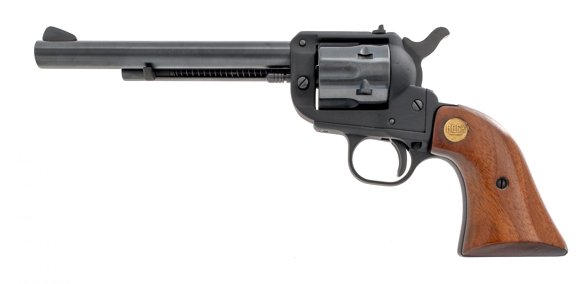 Description West German Reck model R12 chambered in .22 long rifle with a six-shot cylinder and 6″ barrel. Blued barrel, fluted cylinder, trigger, and hammer. Matte finished frame and grip frame with smooth wood grips. Fixed iron sights with U-notch rear and fixed front blade. Must ship to a FFL holder. Condition: Good having been completely refinished with most of the markings being dull/faded. General scratches and handling wear. Light cylinder turn line. Clean rifled bore. Barrel Length: 6″ Serial: 448663 Manufacturer: Reck Caliber: .22 Long Rifle Model: R12 Book# 03451